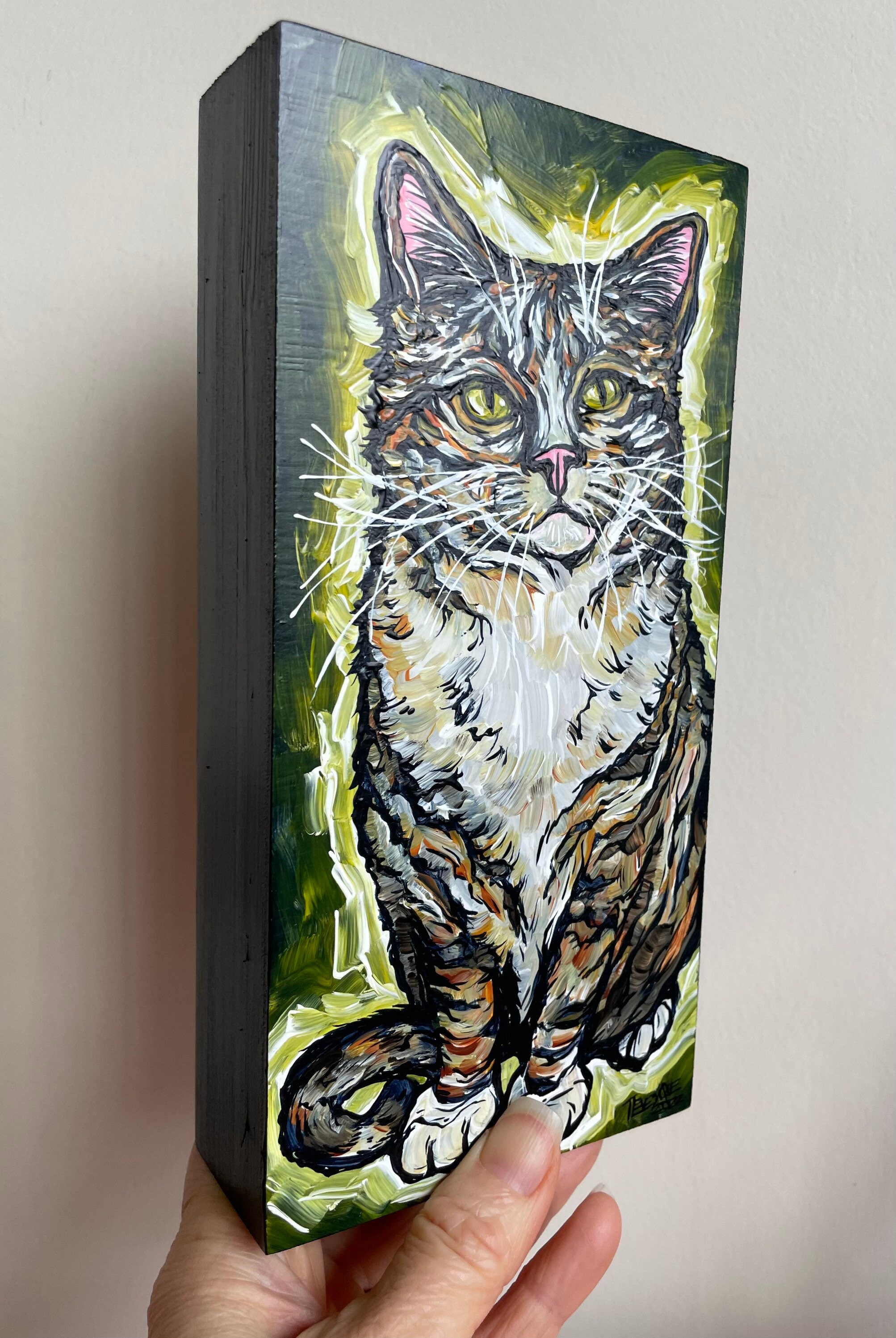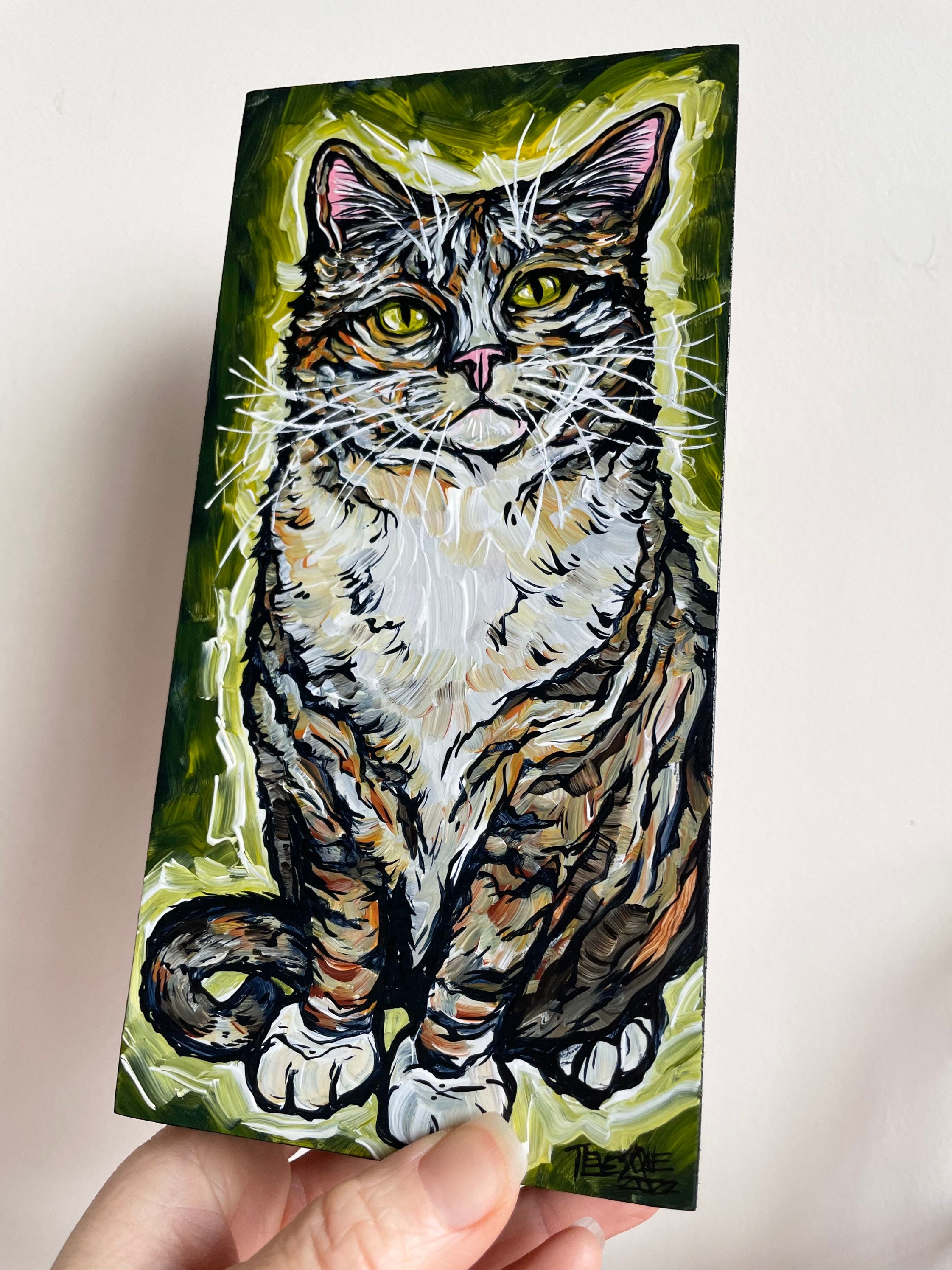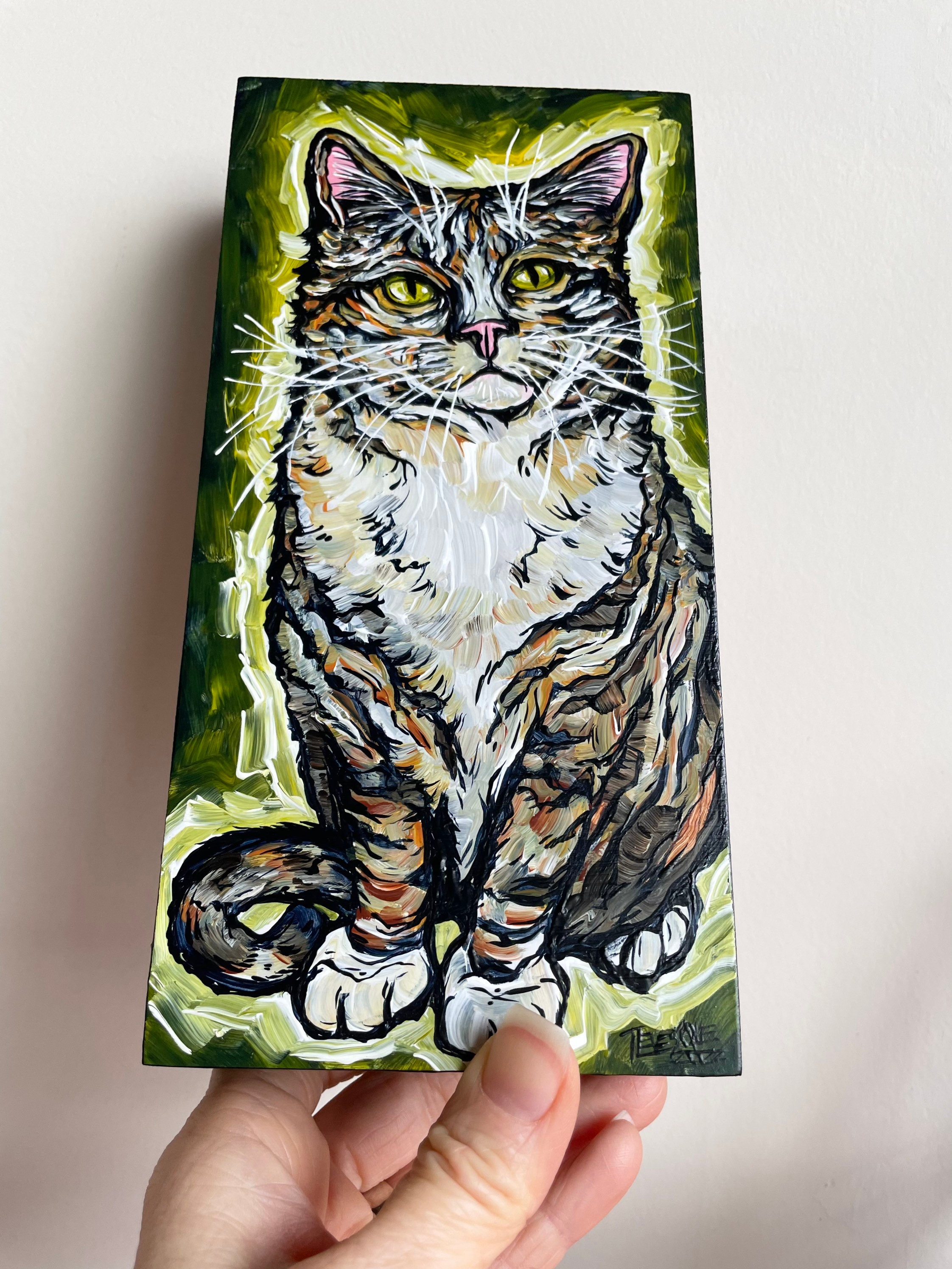 8” height x 4” width acrylic painting on 1.5” deep cradled wood panel. Edges painted black for a clean finish. Ready to hang on the wall (hanging wire attached on back). Painting can also sit on a shelf or ledge so displaying it is easy peasy.
