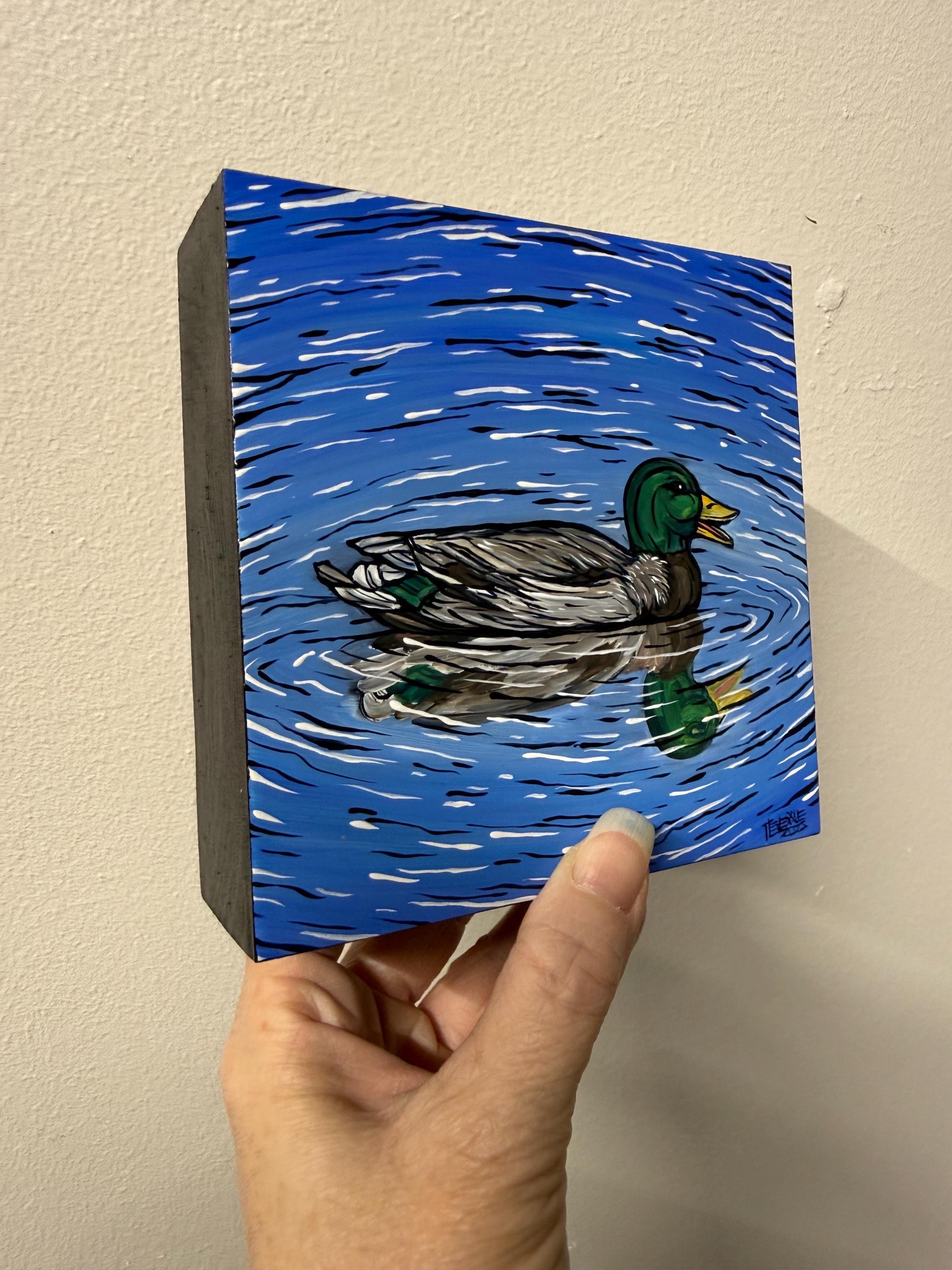 5” height x 5” width acrylic painting on 1.5” deep cradled wood panel - piece can also sit on shelf or hang in the wall