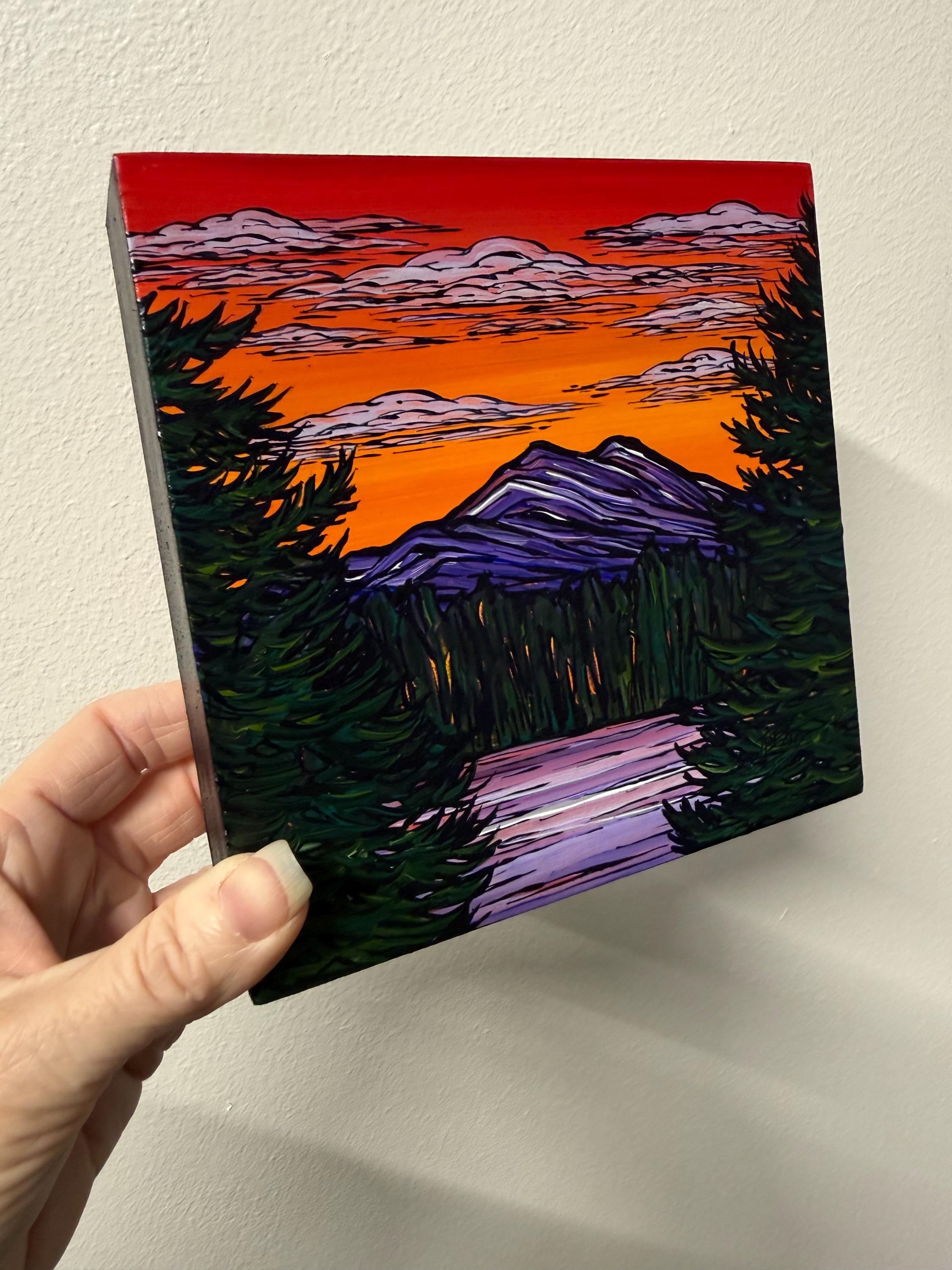 6" height by 6" width acrylic painting on 1.5” deep cradled wood panel wired and ready to hang. Edges painted black for an unframed contemporary look. Piece can also sit on a shelf or ledge