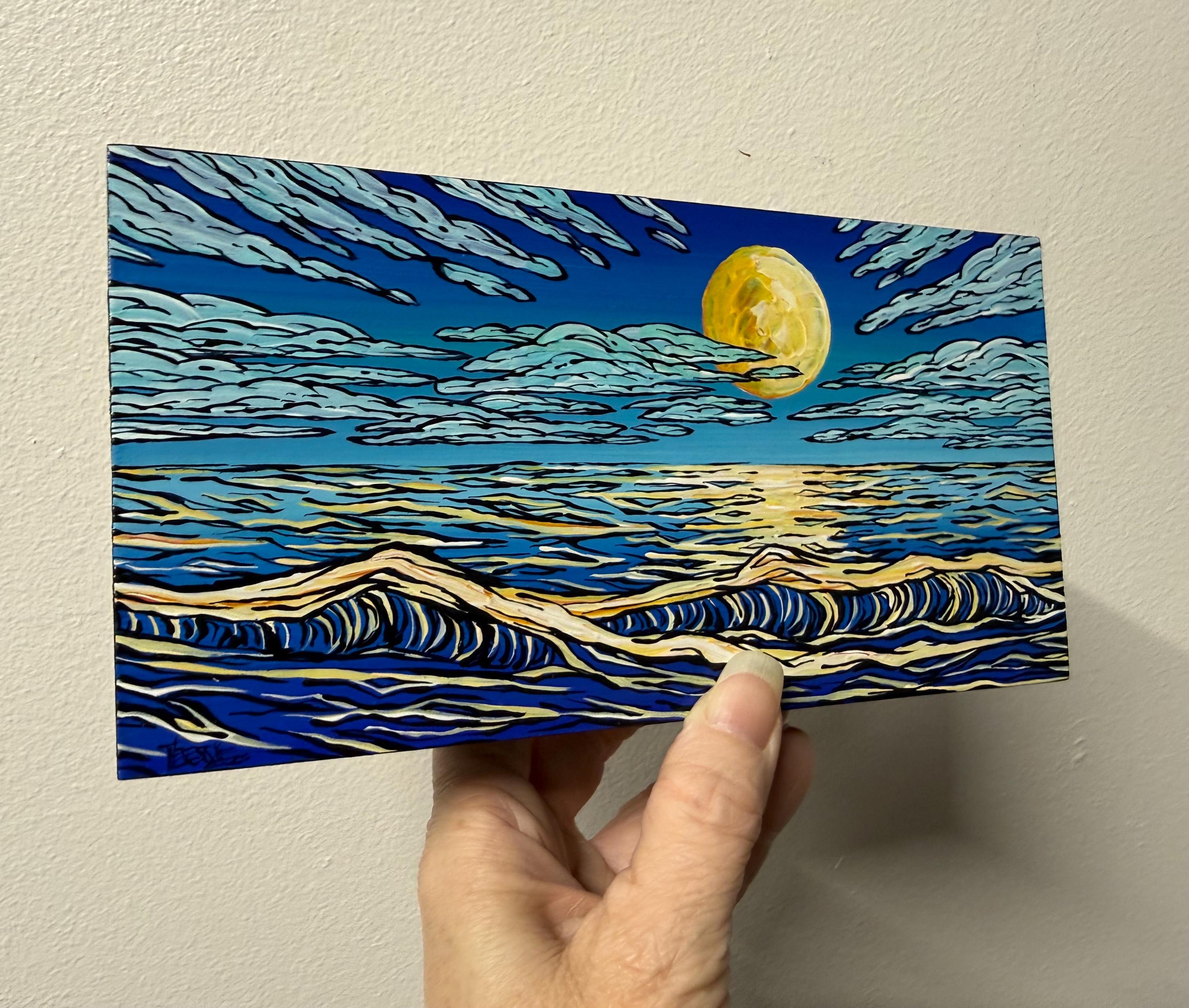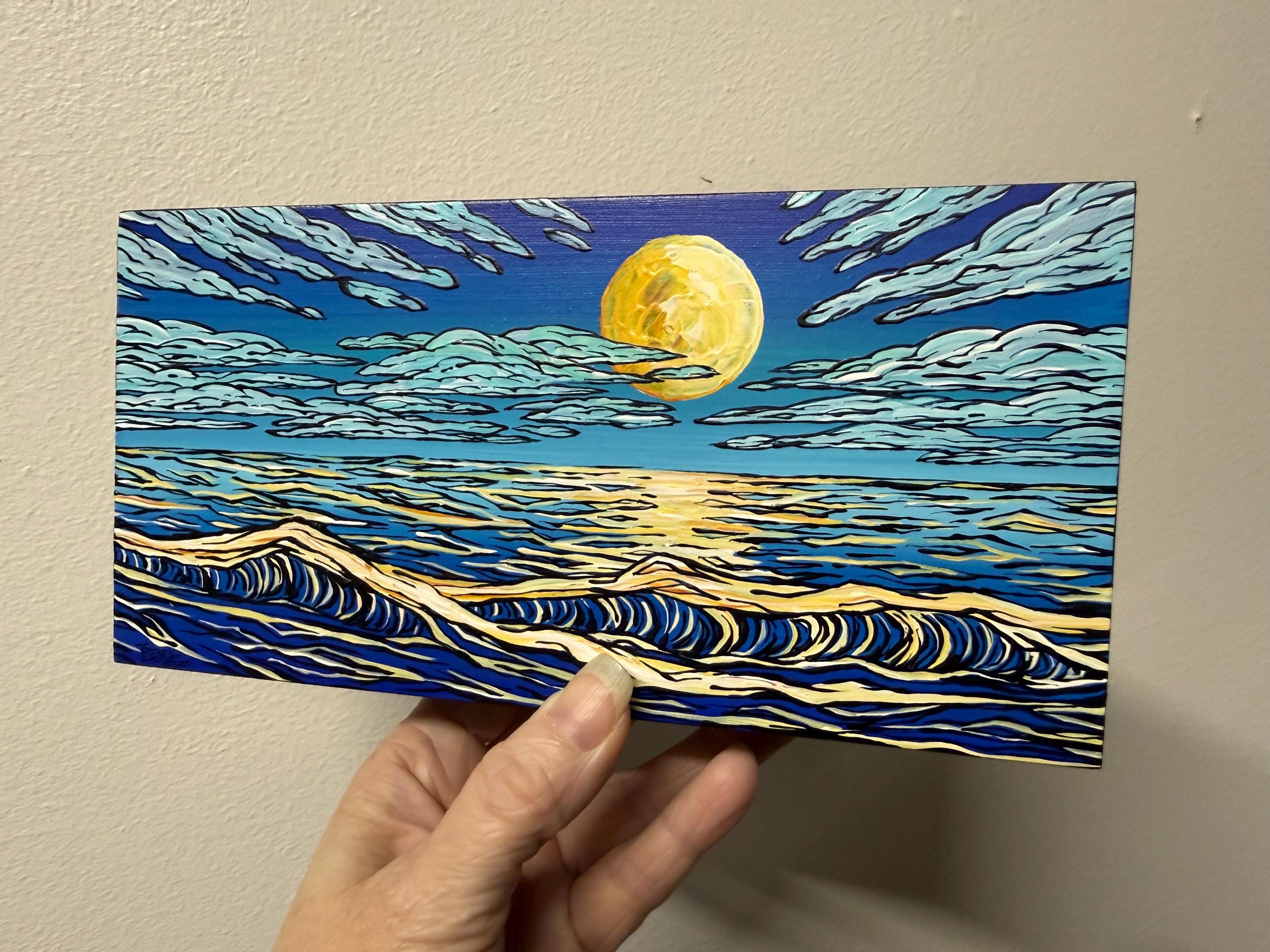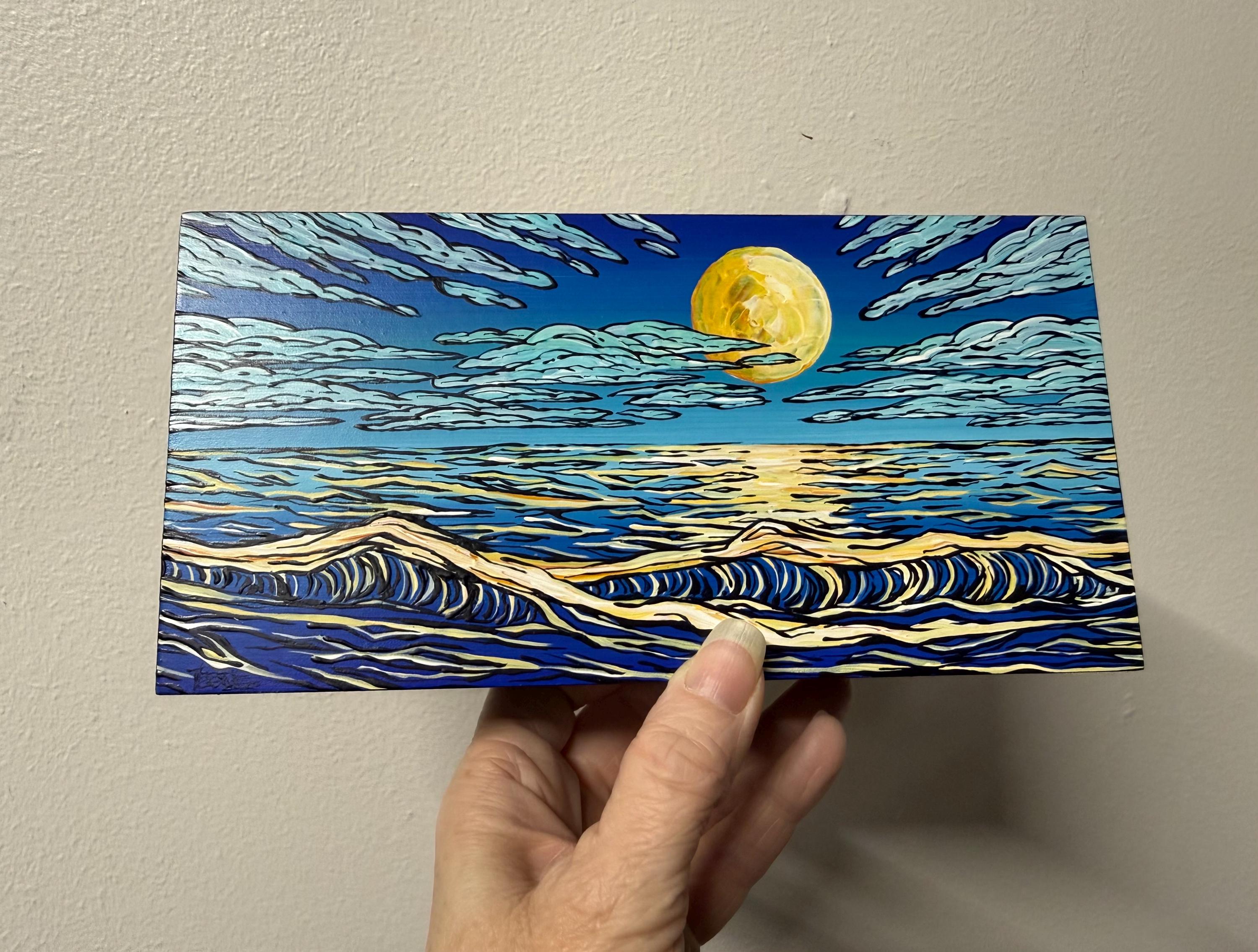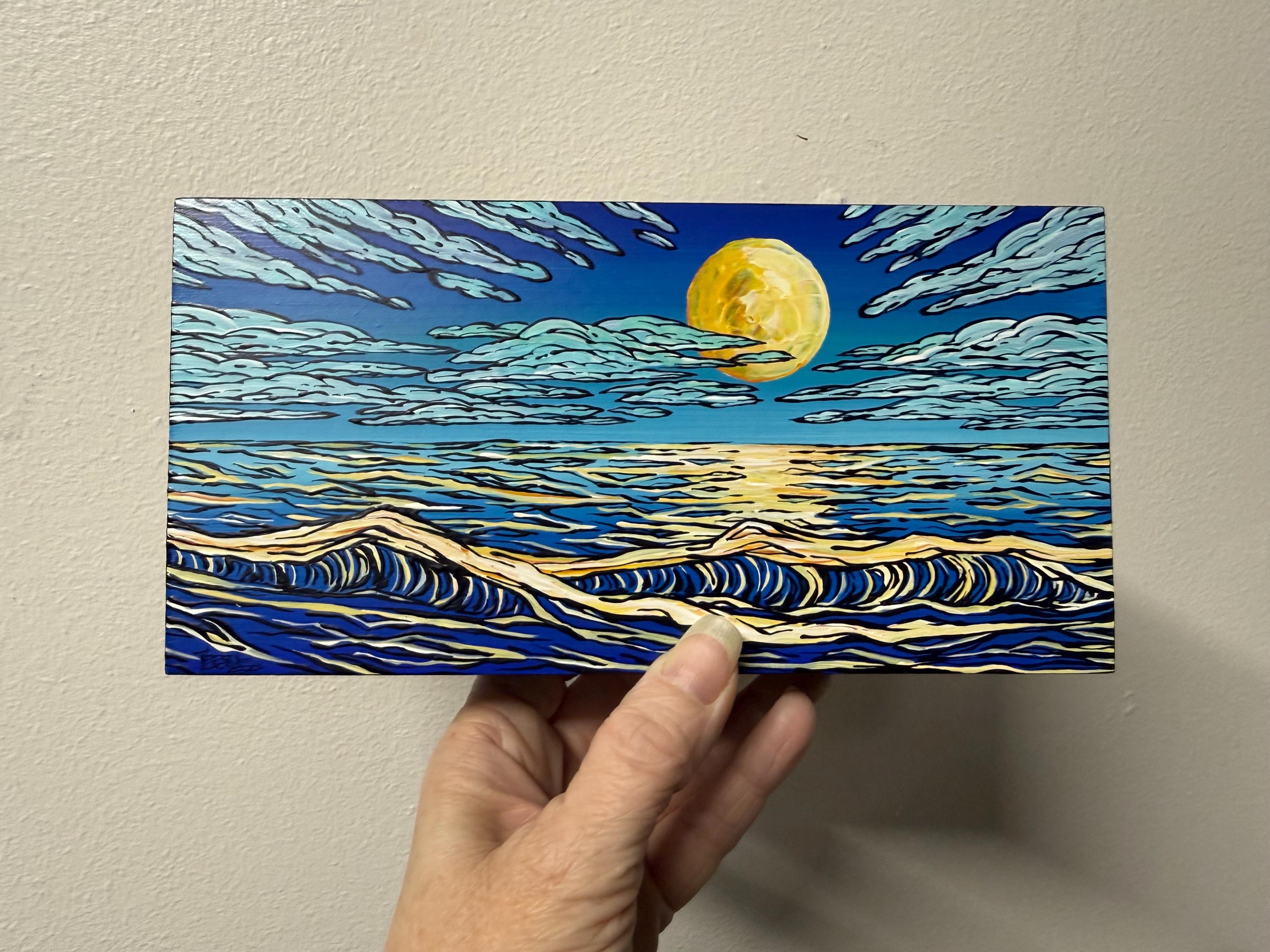 4” height x 8” width acrylic painting on 1.5” deep cradled wood panel. Edges painted black for a clean finish. Ready to hang on the wall (hanging wire attached on back). Painting can also sit on a shelf or ledge so displaying it is easy peasy.