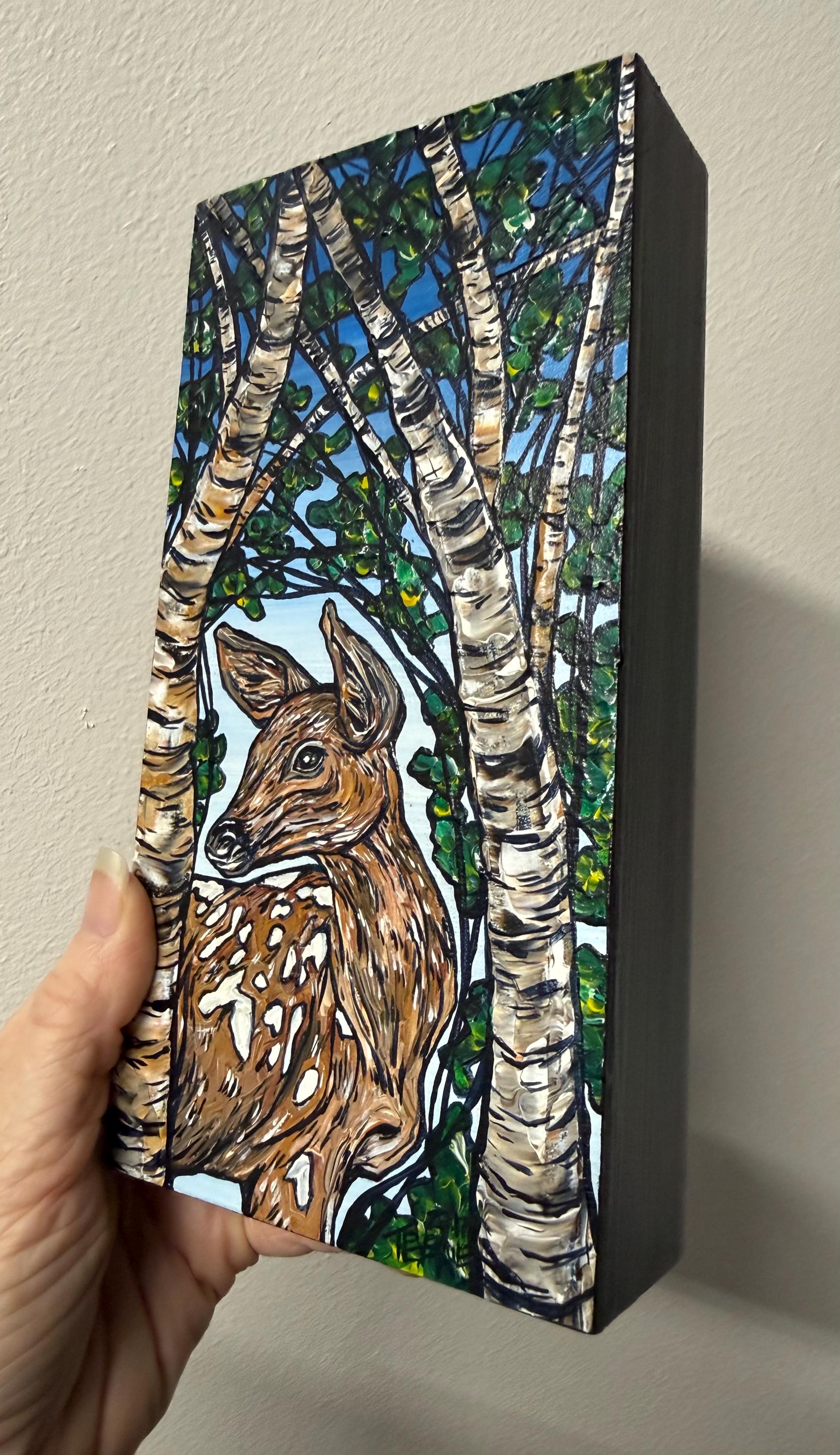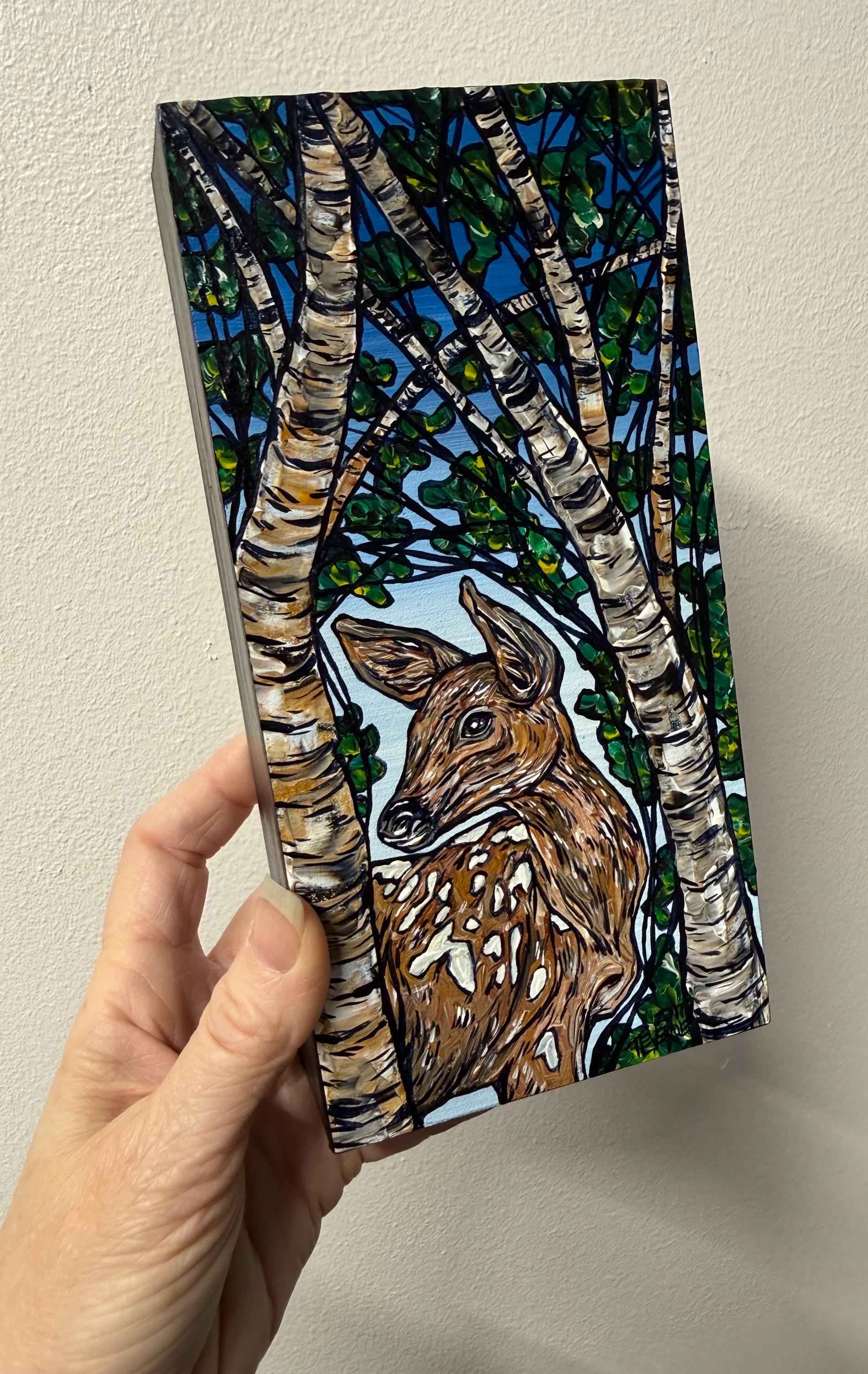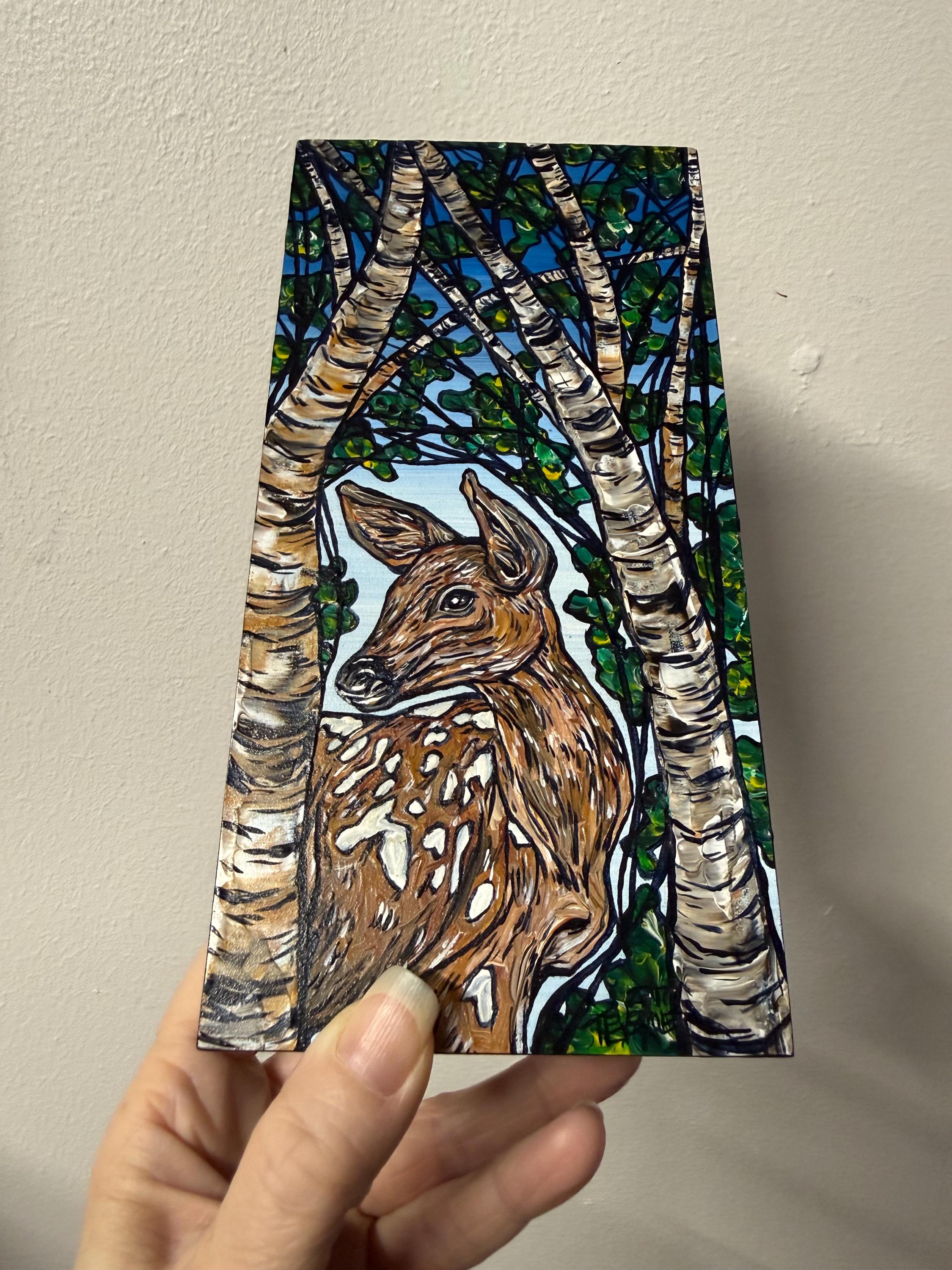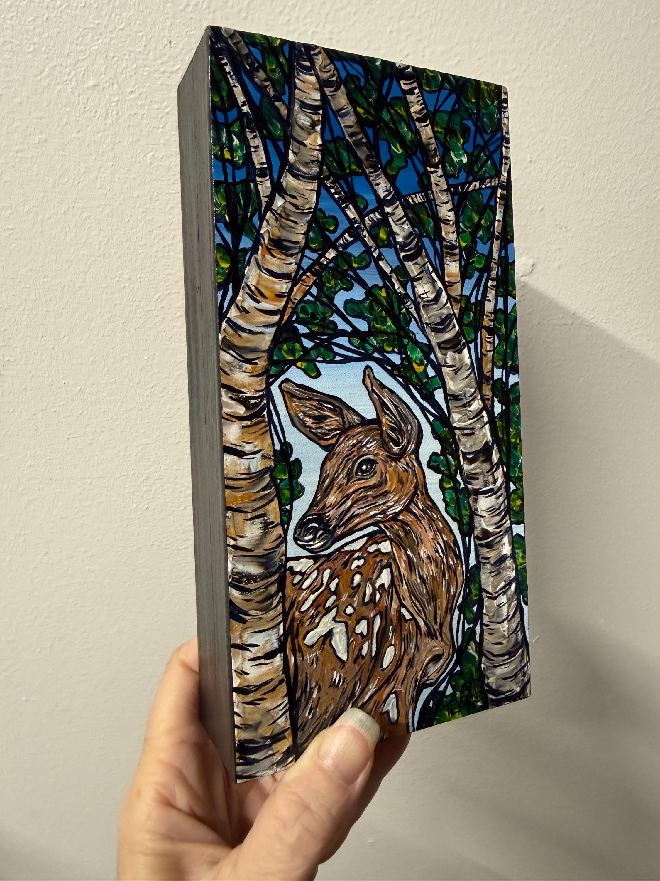 8” height x 4” width acrylic painting on 1.5” deep cradled wood panel. Edges painted black for a clean finish. Ready to hang on the wall (hanging wire attached on back). Painting can also sit on a shelf or ledge so displaying it is easy peasy.