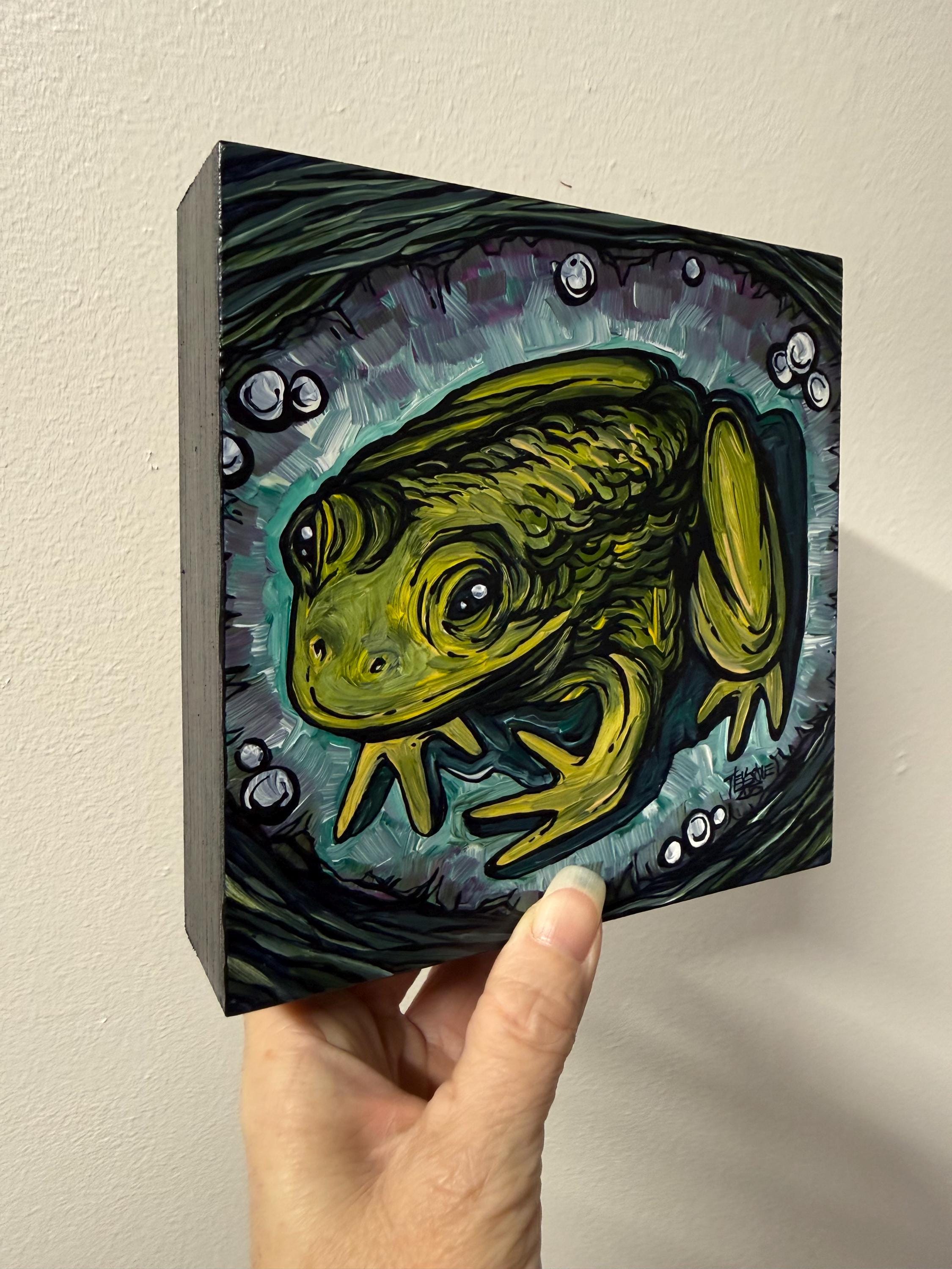 6" height by 6" width acrylic painting on 1.5” deep cradled wood panel wired and ready to hang. Edges painted black for an unframed contemporary look. Piece can also sit on a shelf or ledge