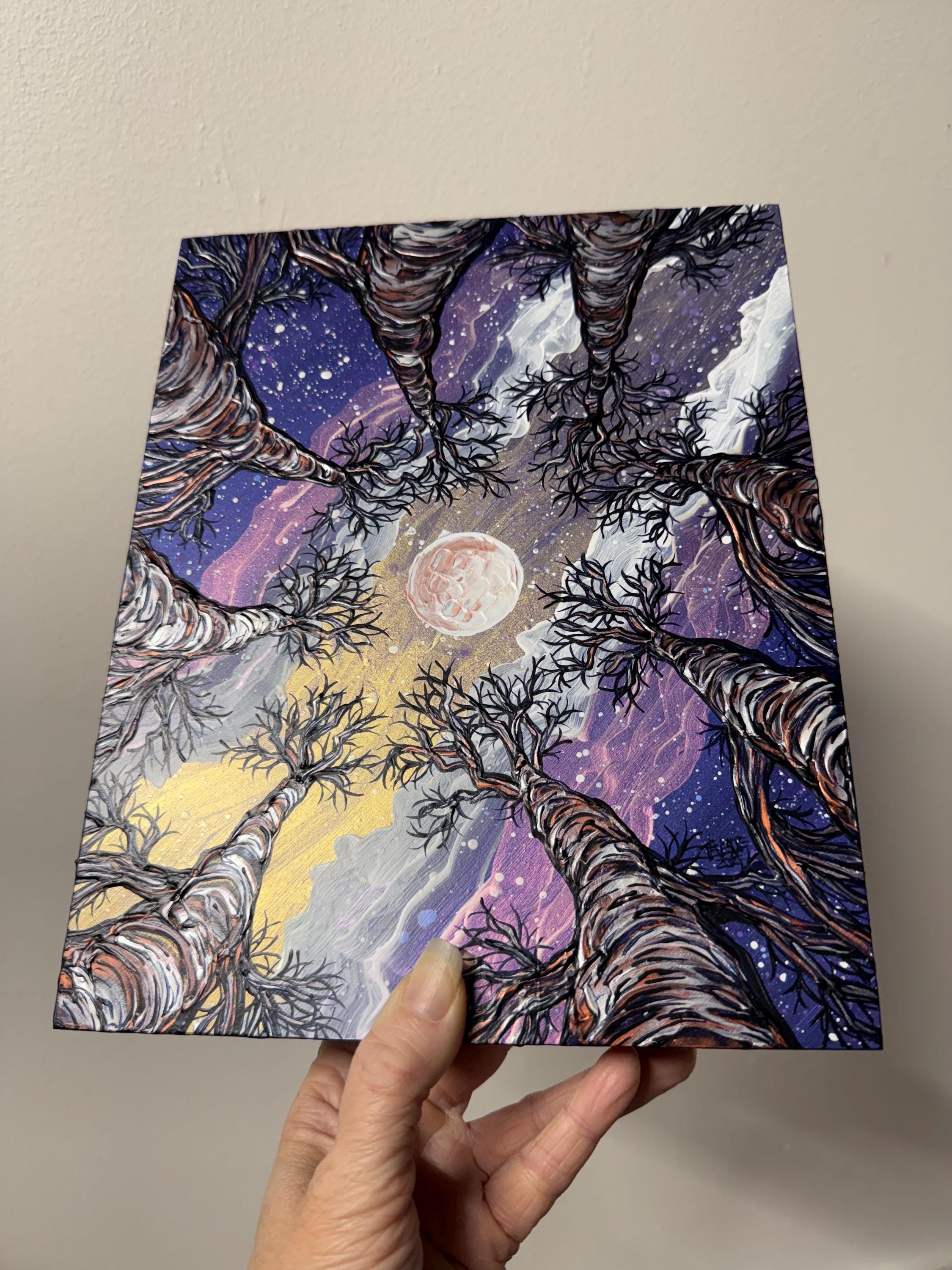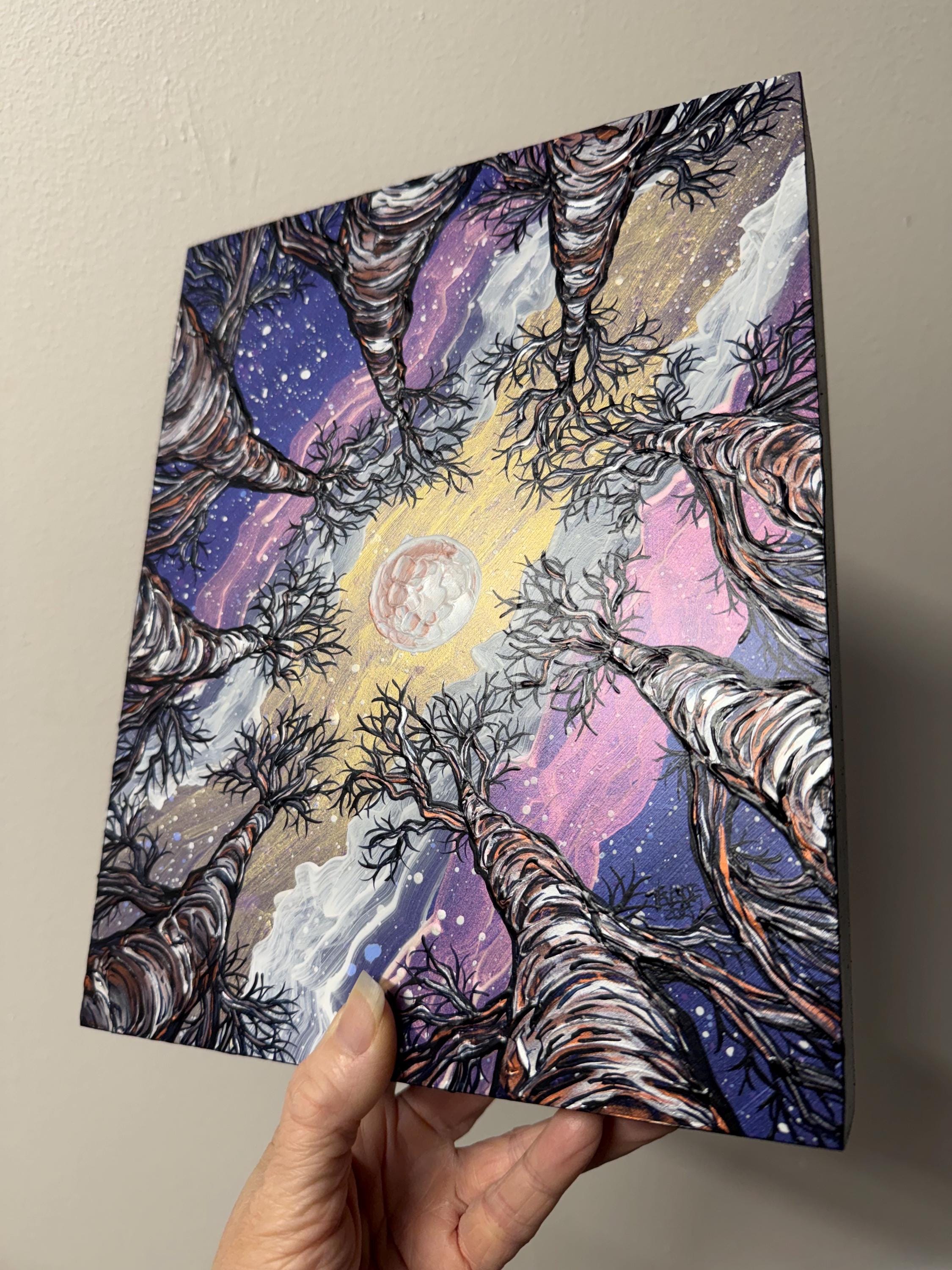 Acrylic painting on wood is varnished and ready to hang. Edges painted black for an unframed contemporary look.