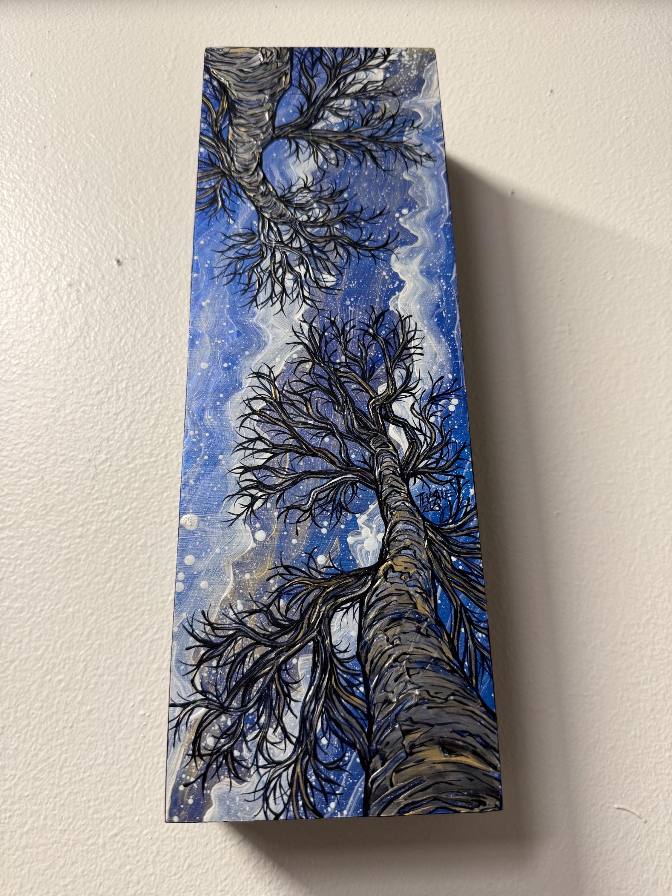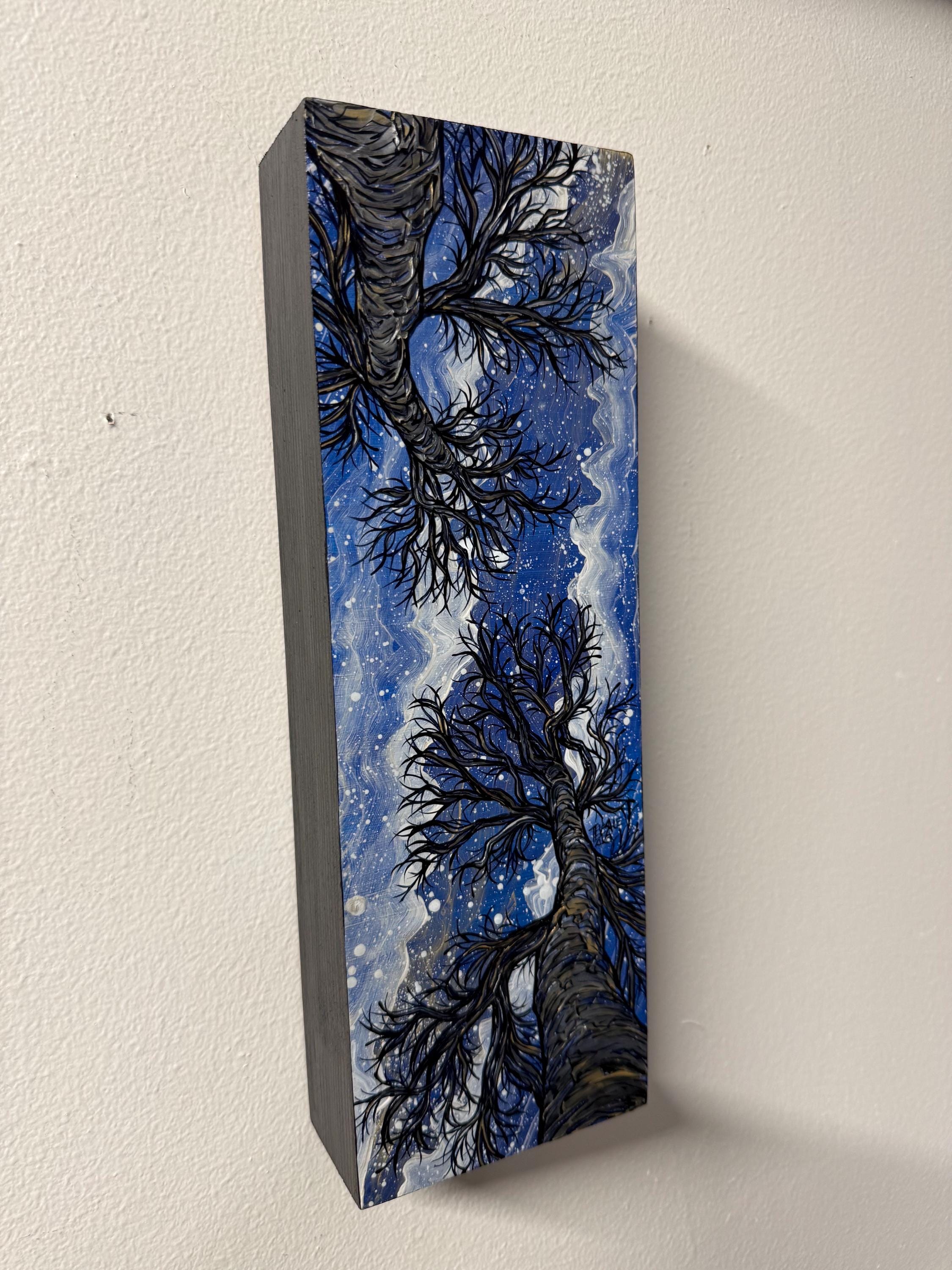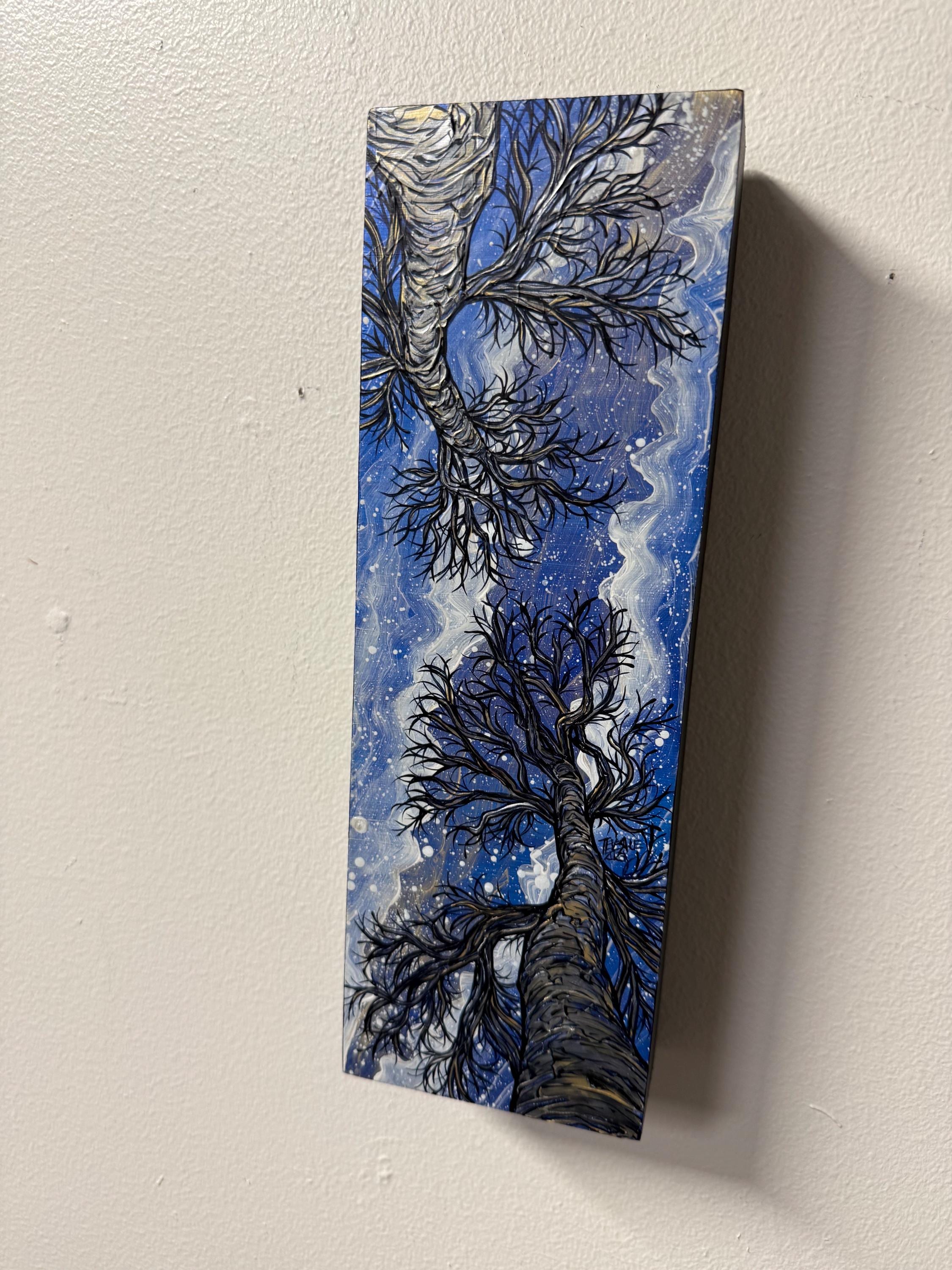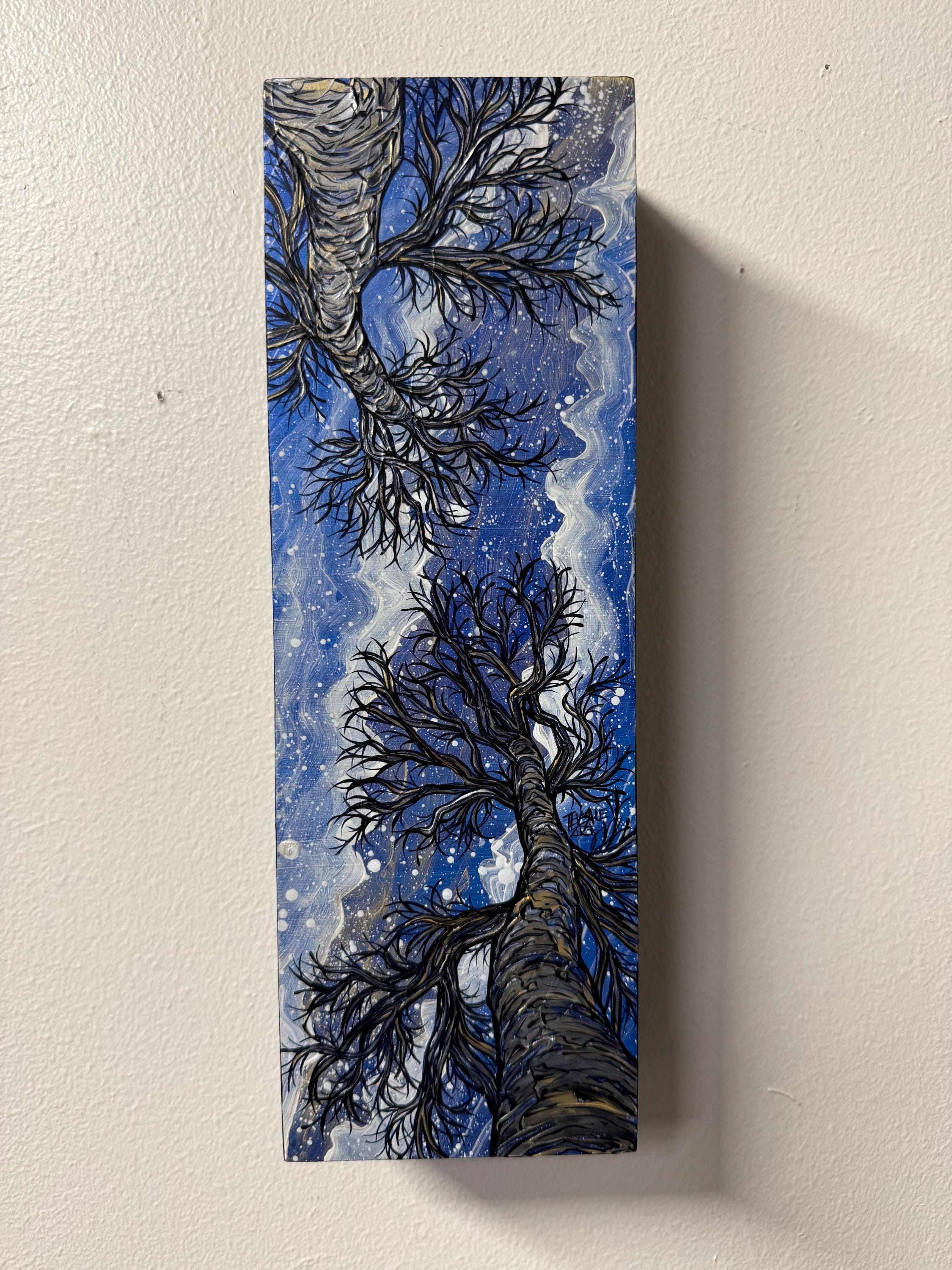 4x12” Cosmic Twin Milky Way Trees iridescent acrylic painting by Tracy Levesque