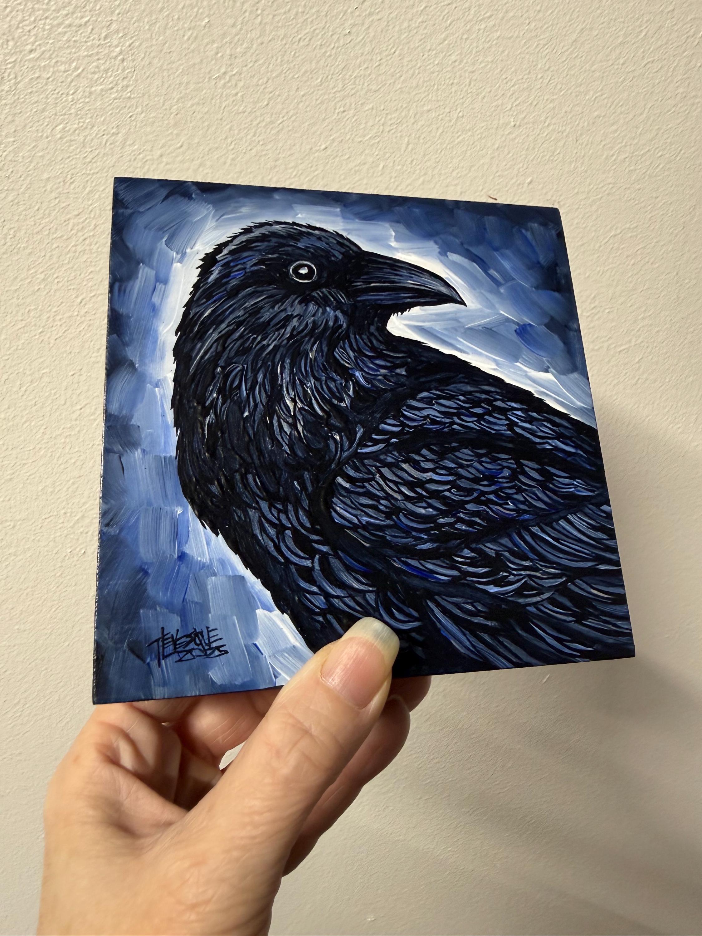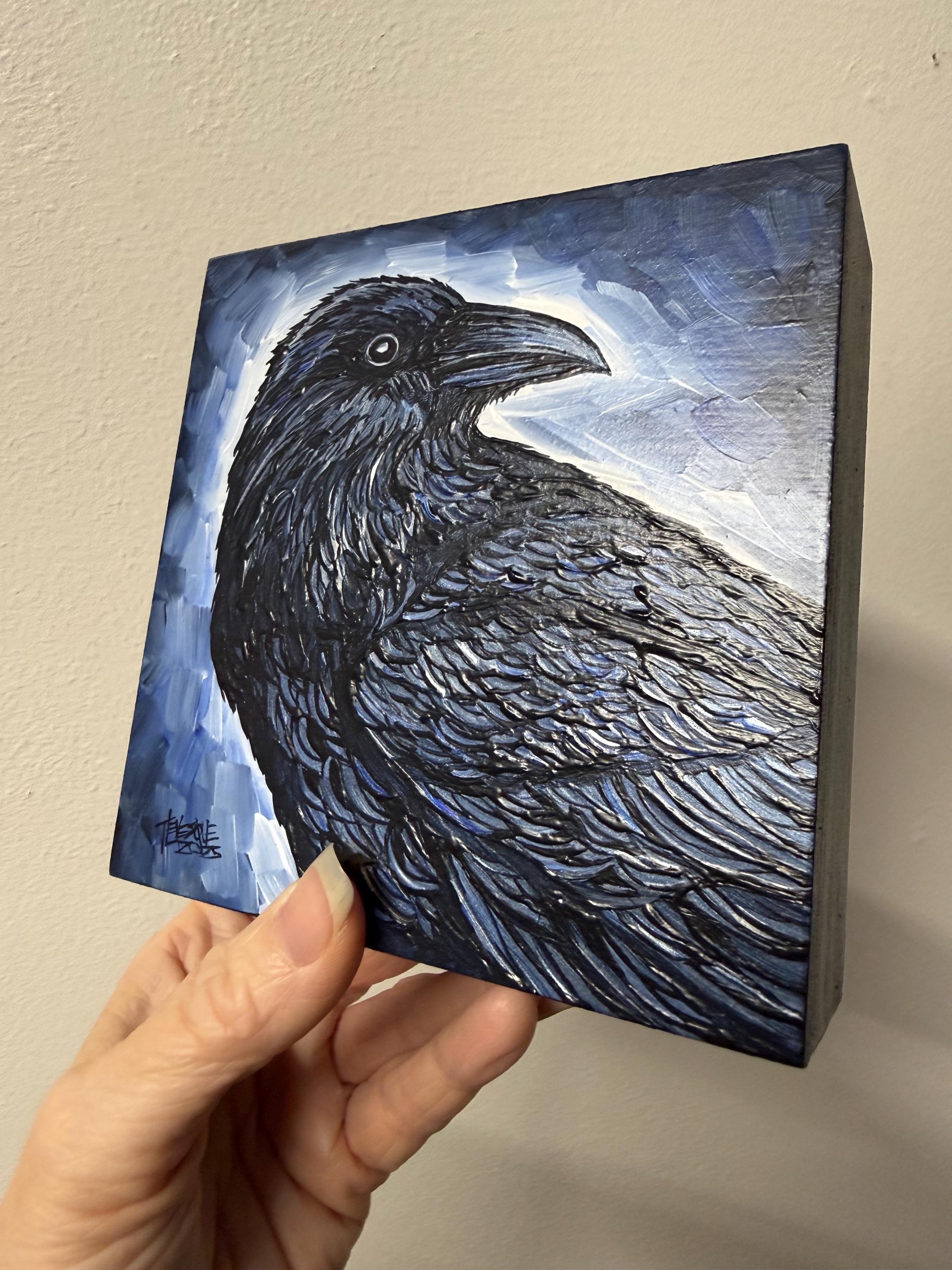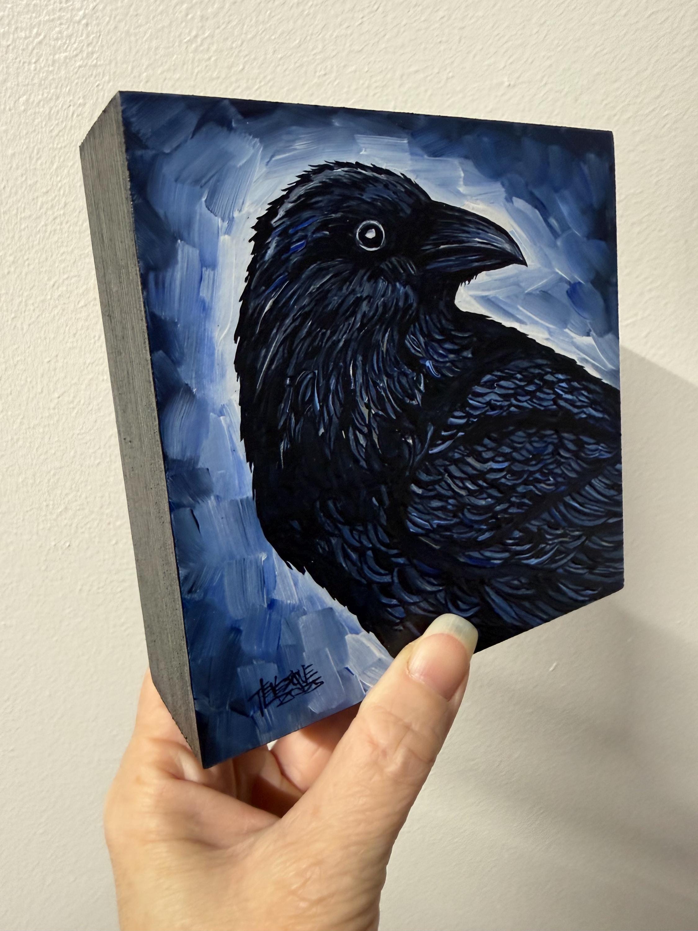 5” height x 5” width acrylic painting on 1.5” deep cradled wood panel - piece can also sit on shelf or hang in the wall