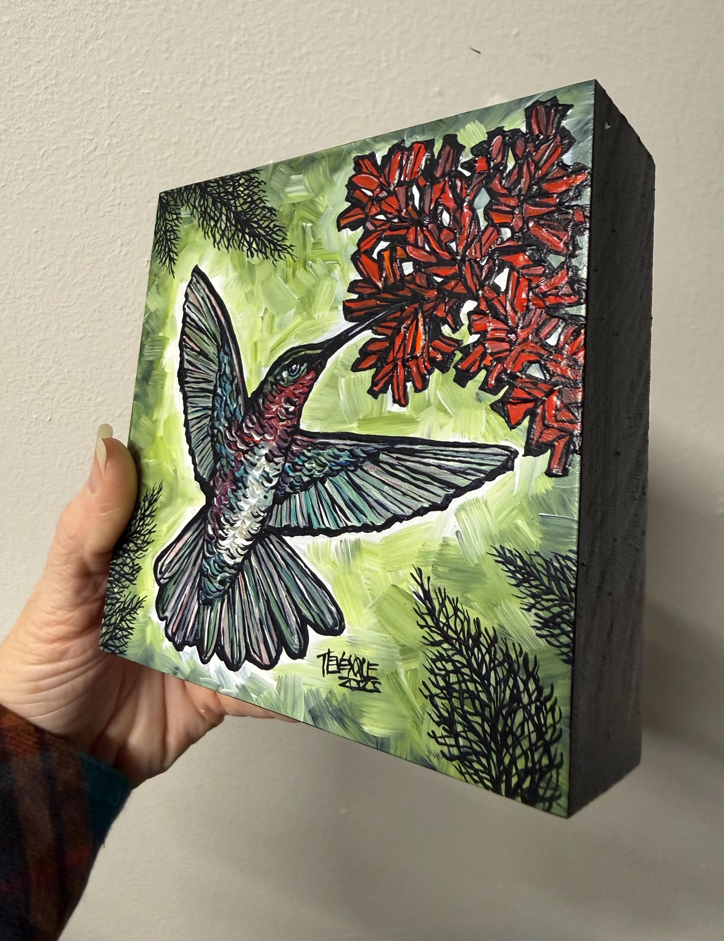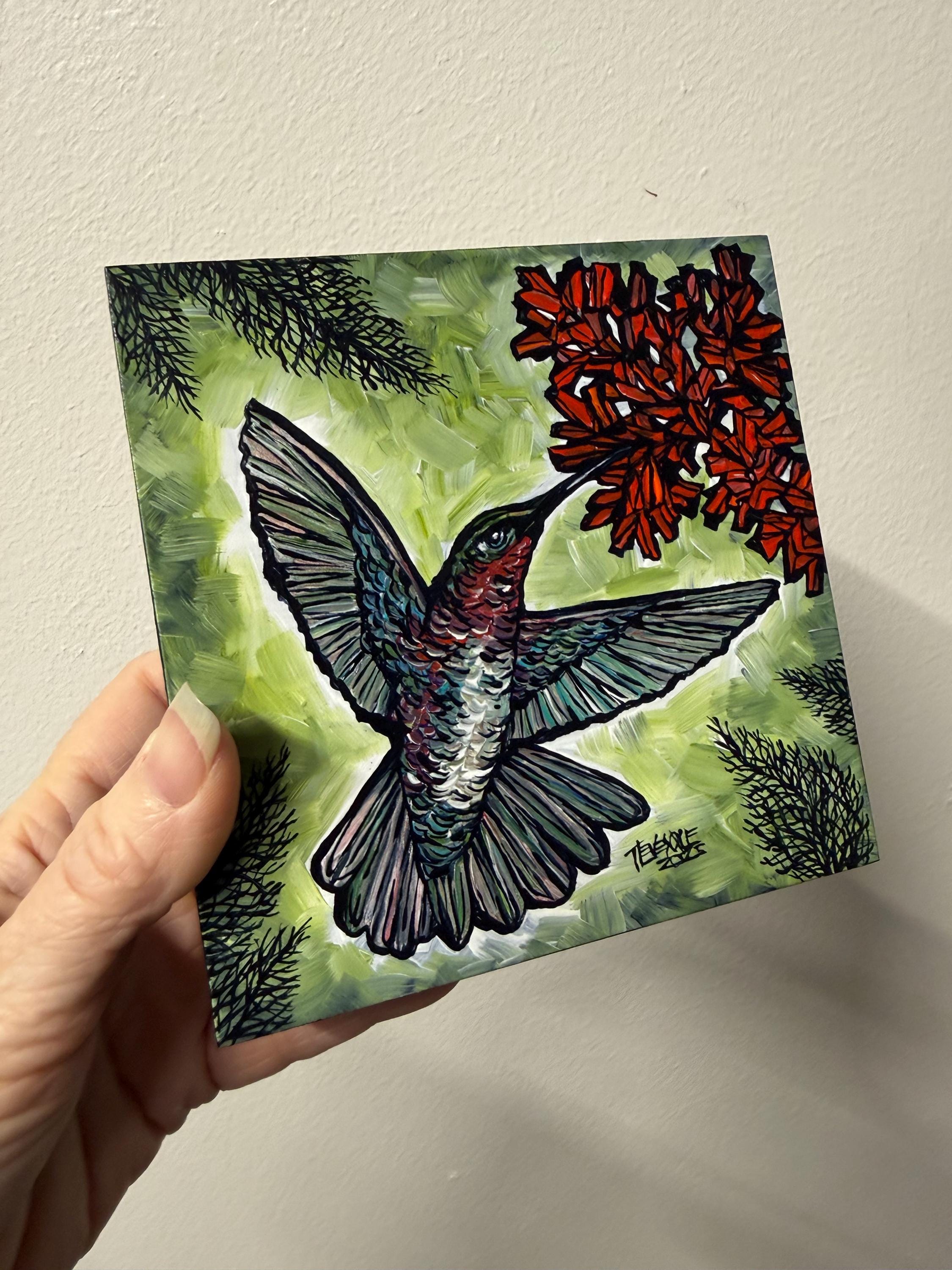 5” height x 5” width acrylic painting on 1.5” deep cradled wood panel - piece can also sit on shelf or hang in the wall