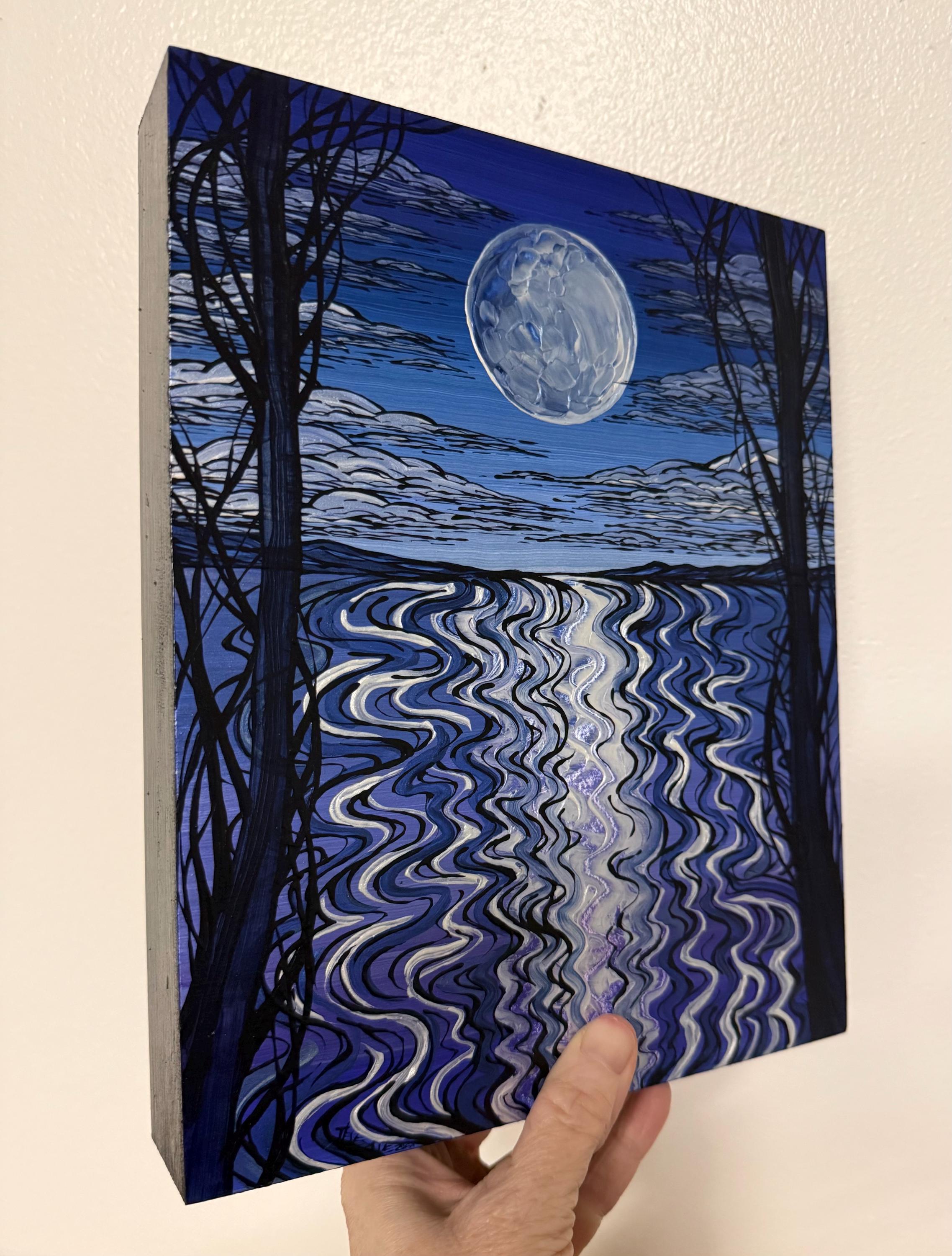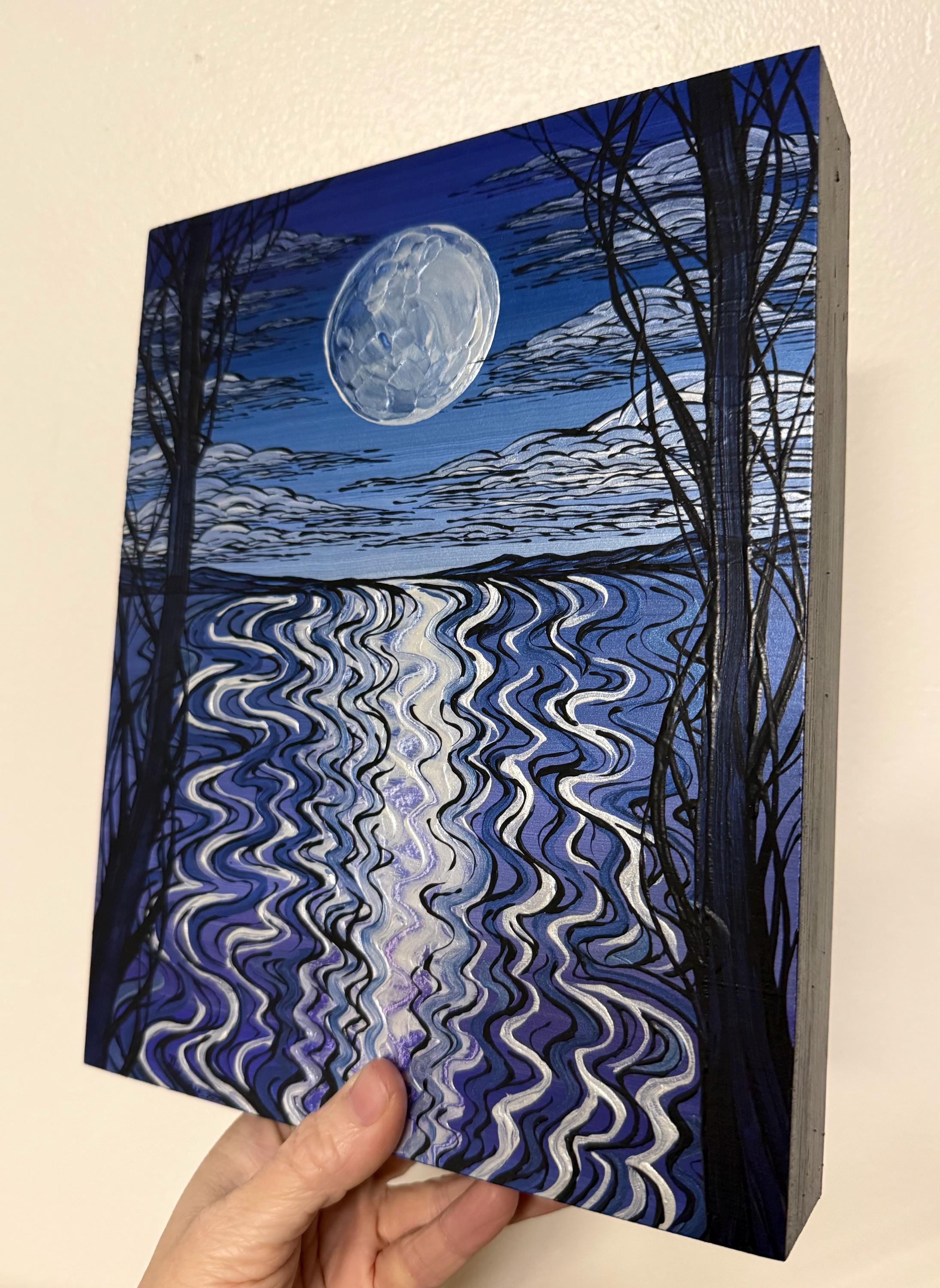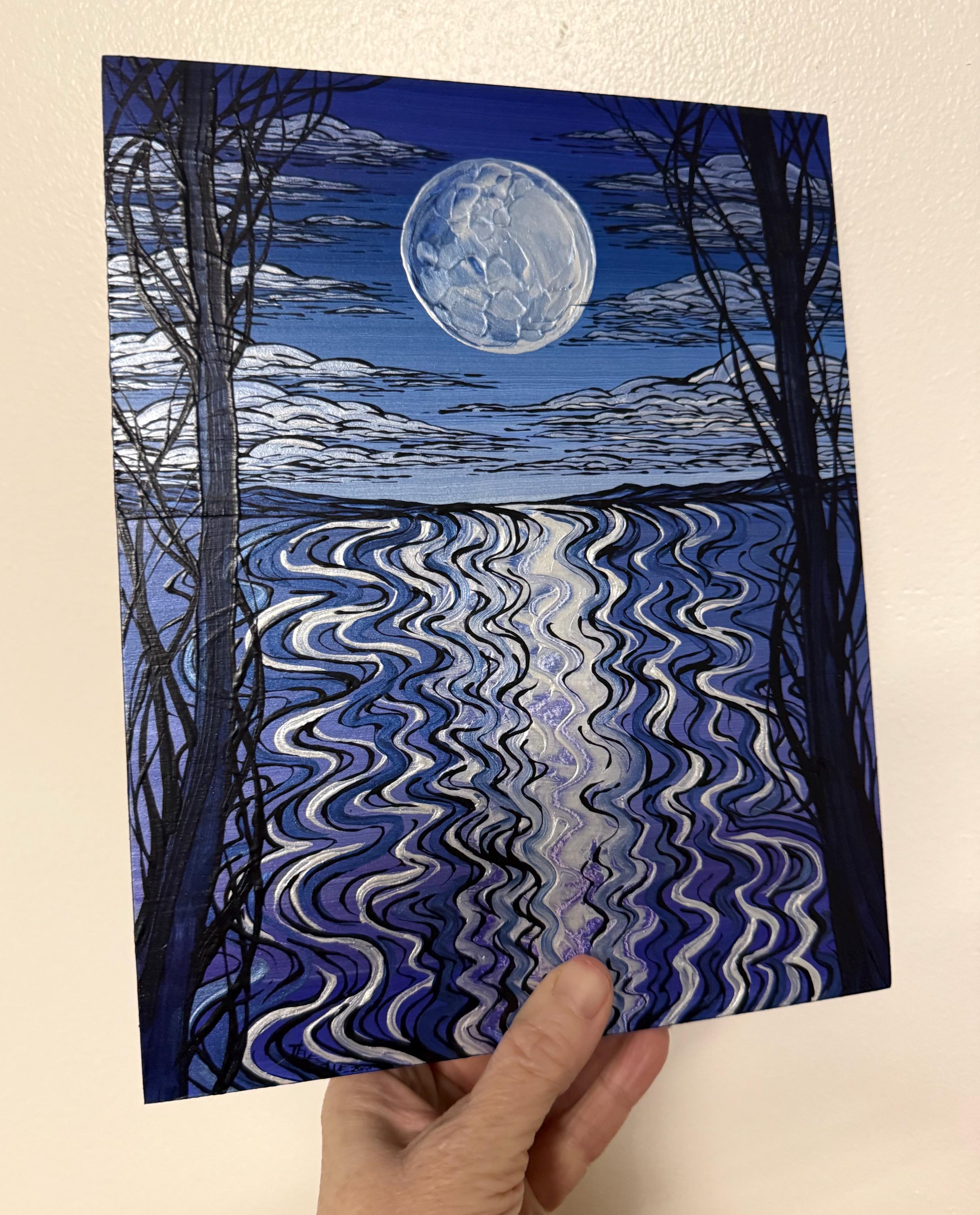 Acrylic painting on wood is varnished and ready to hang. Edges painted black for an unframed contemporary look.