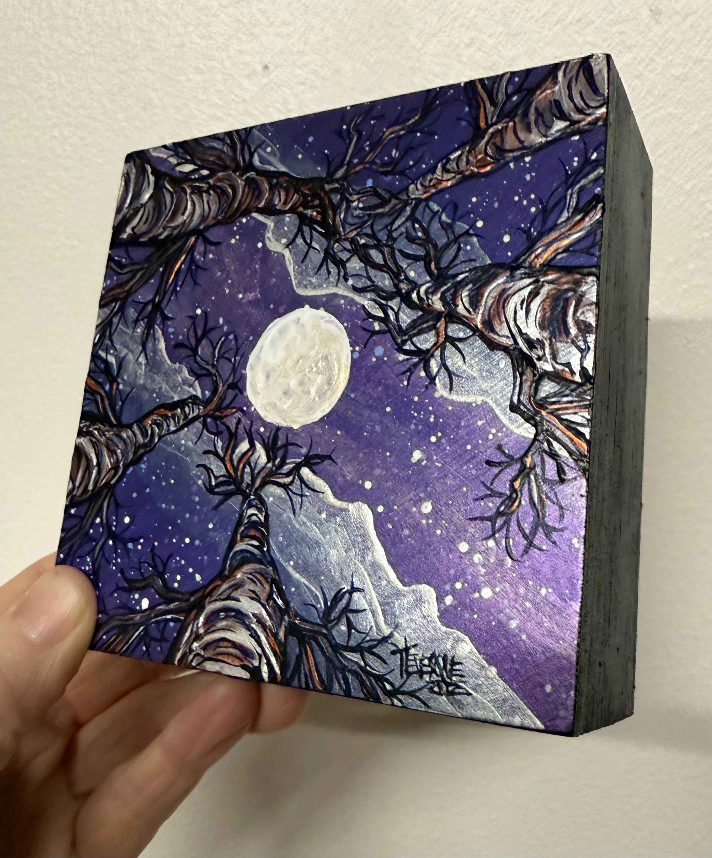 4" height x 4" width acrylic painting on 1.5” deep cradled wood panel. Painting can sit on shelf or hang on the wall