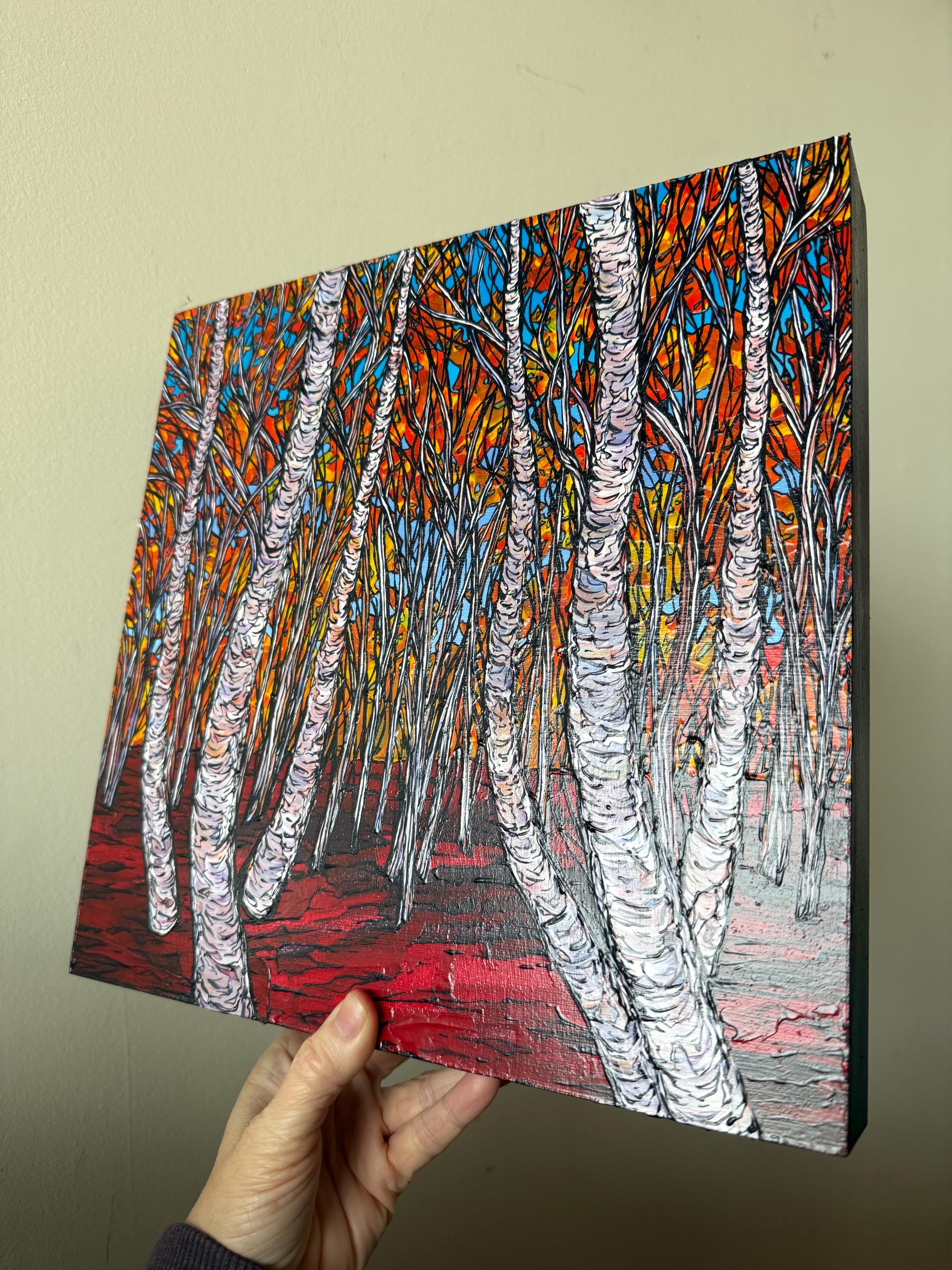 12 inches height x 12 inches width acrylic painting on 1.5 inches deep cradled wood panel. Unframed painting is ready to hang with hanging wire attached on the back. Edges of painting are painted black for an unframed contemporary look.