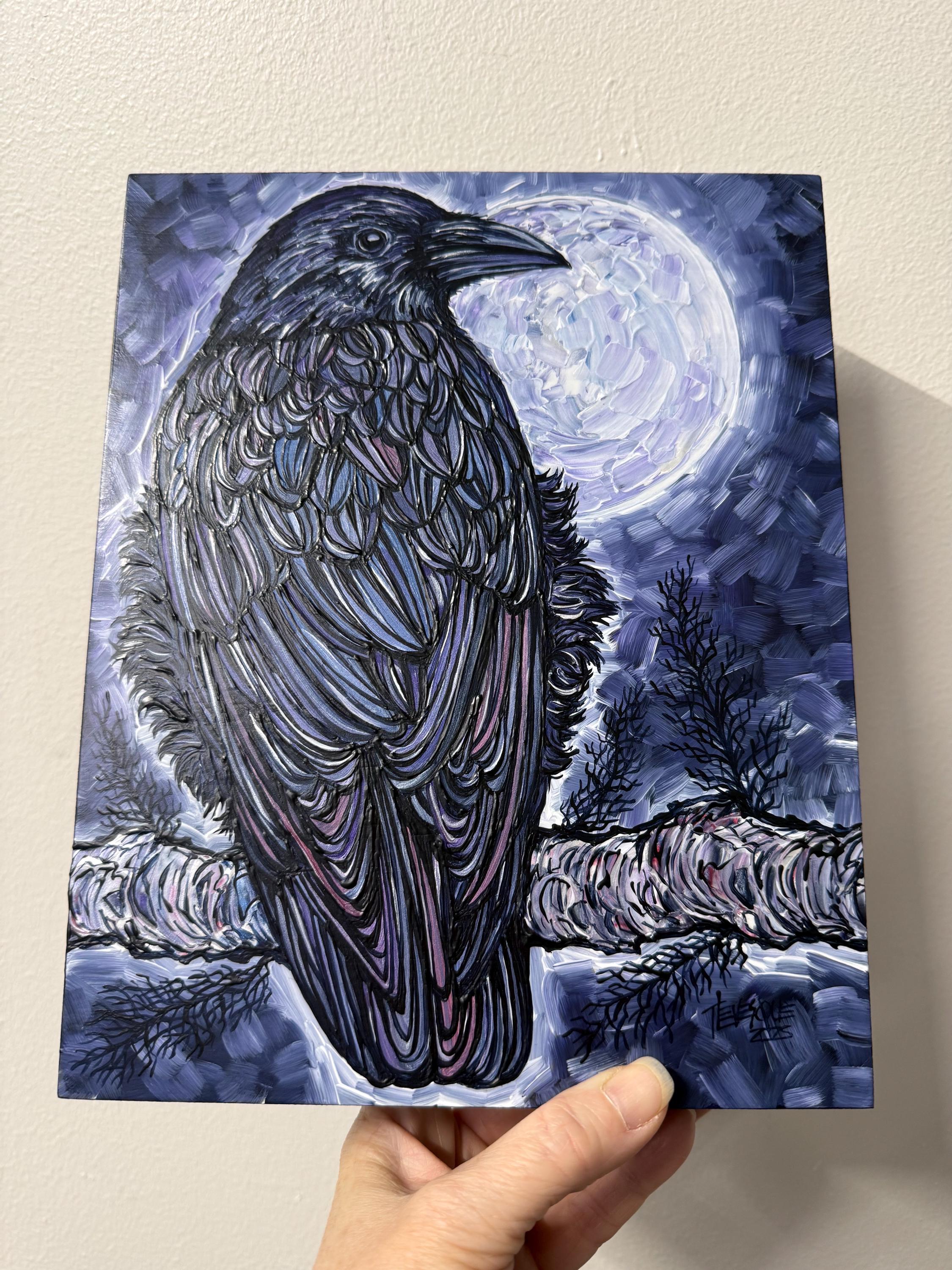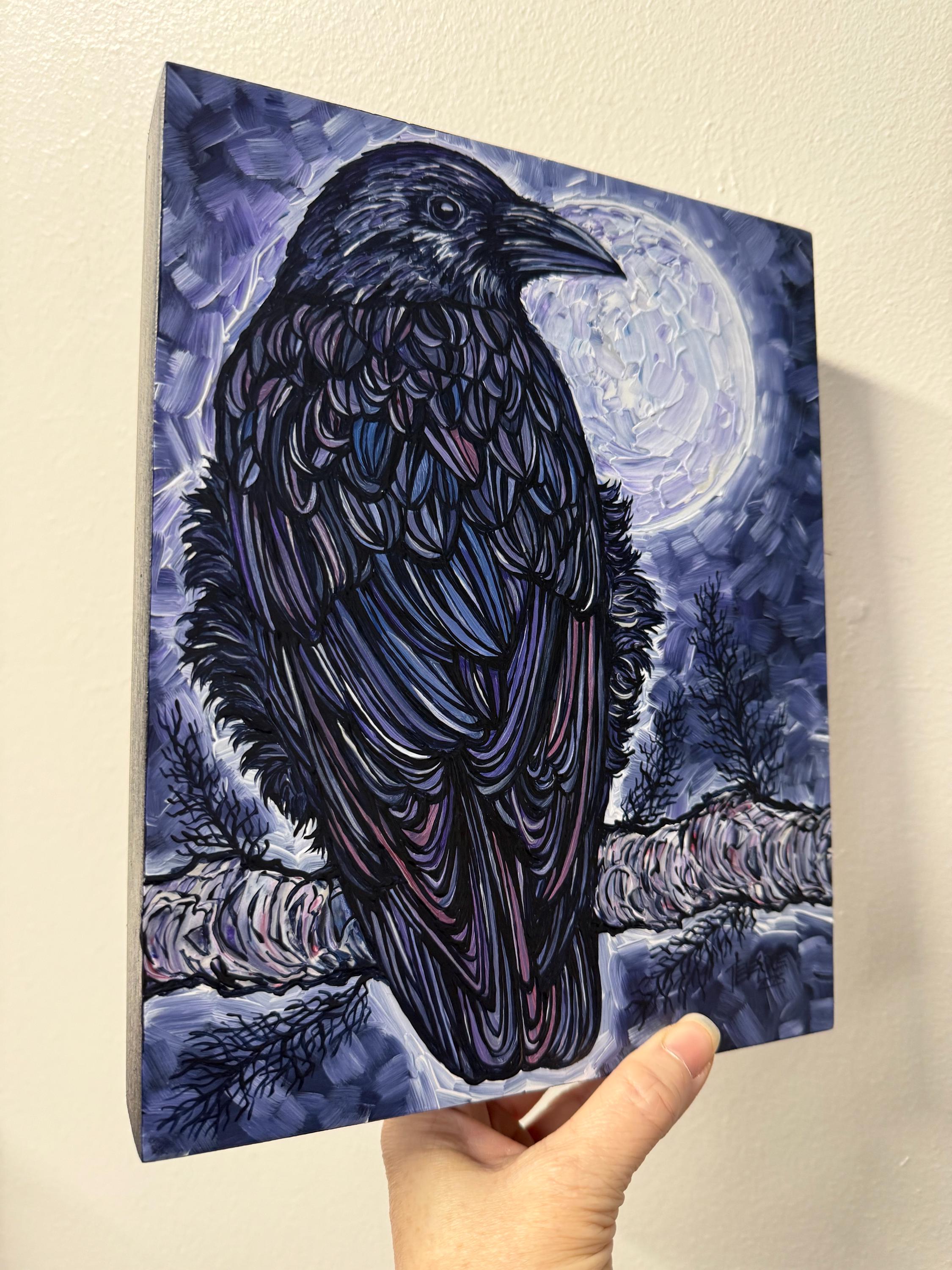 Moonlit Crow Painting by Tracy Levesque: Originl Bird Art (8x10”)
