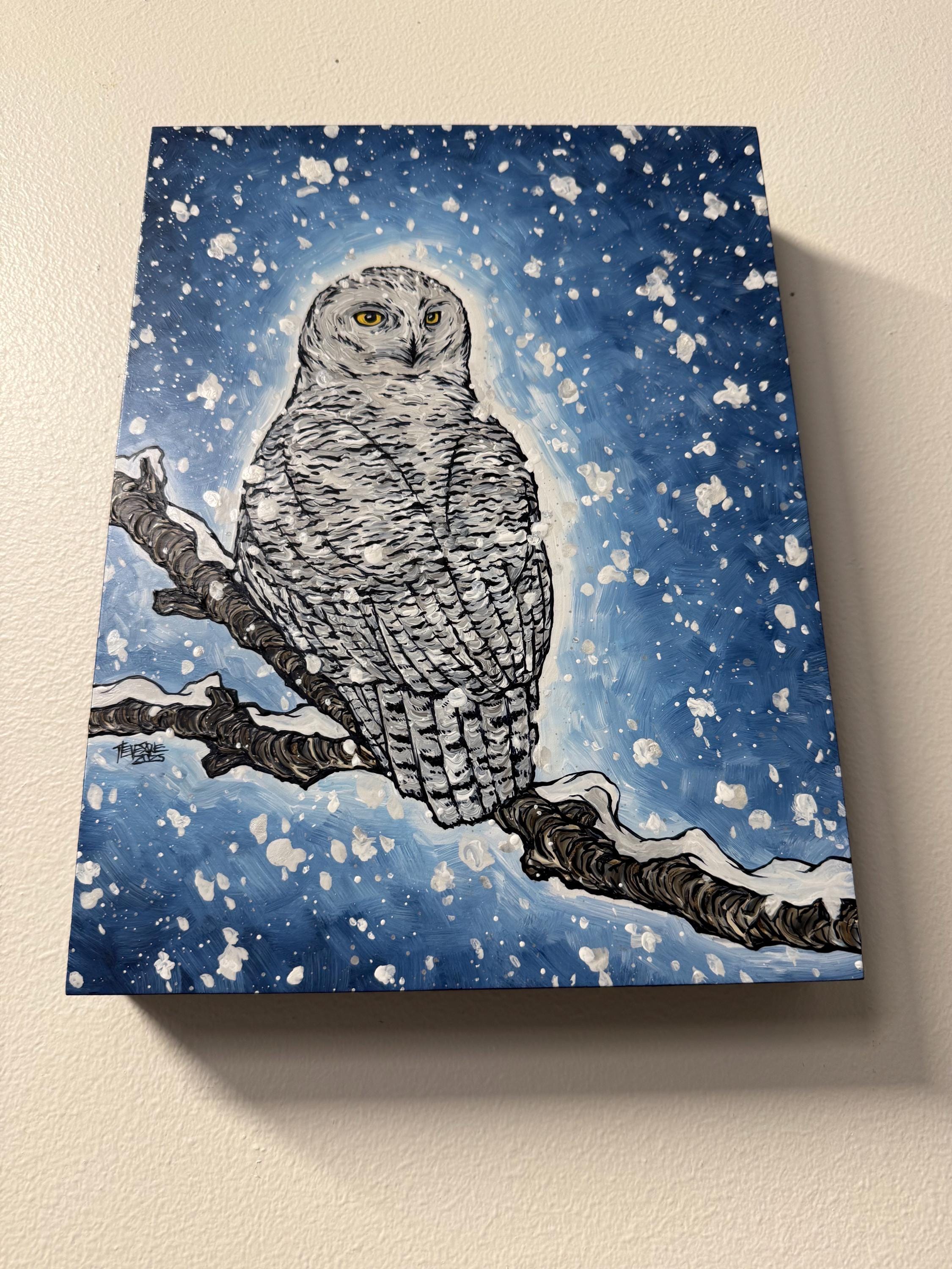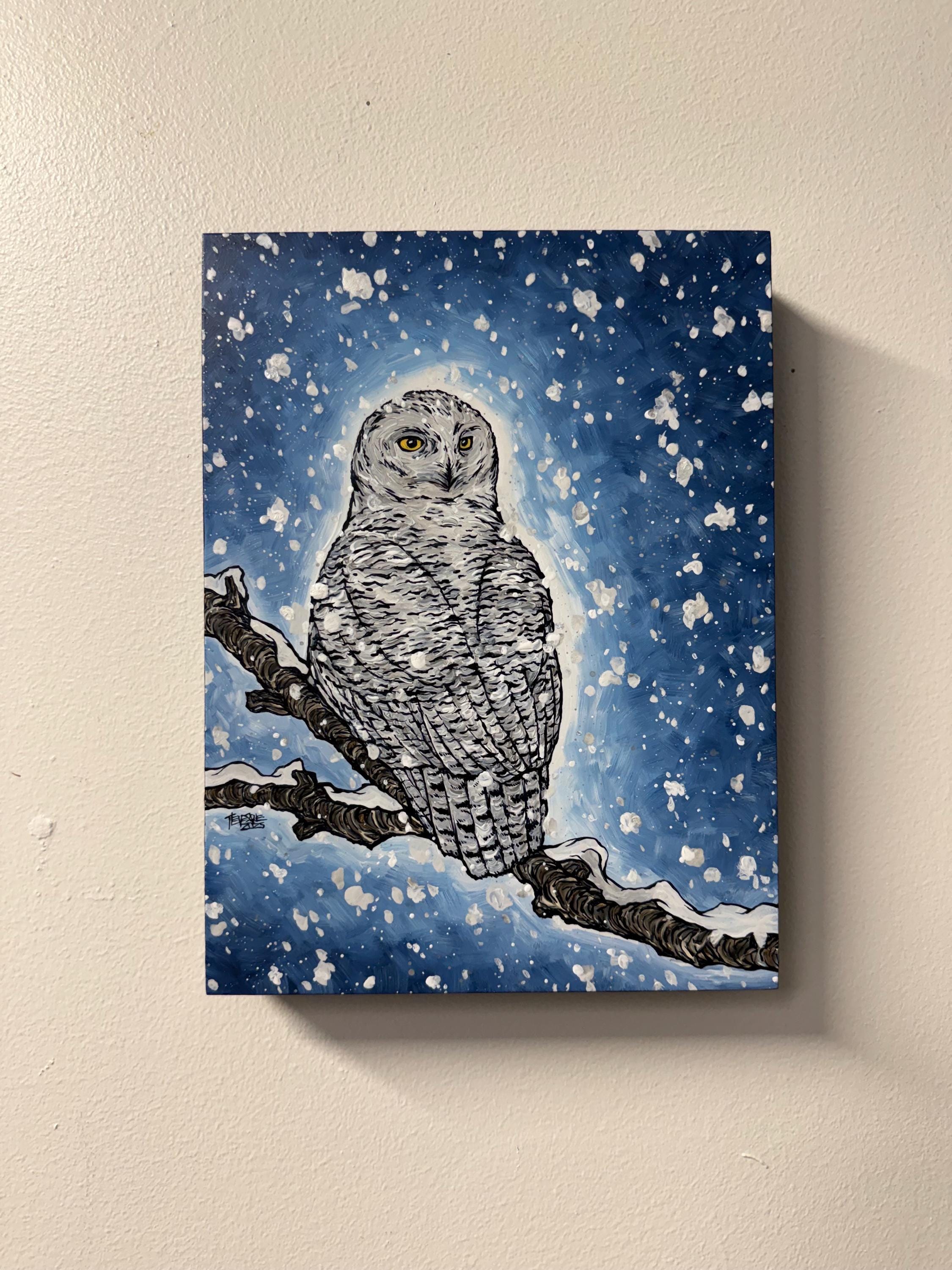 Get lost in all the intricate details of this lovely winter snowy owl painting.