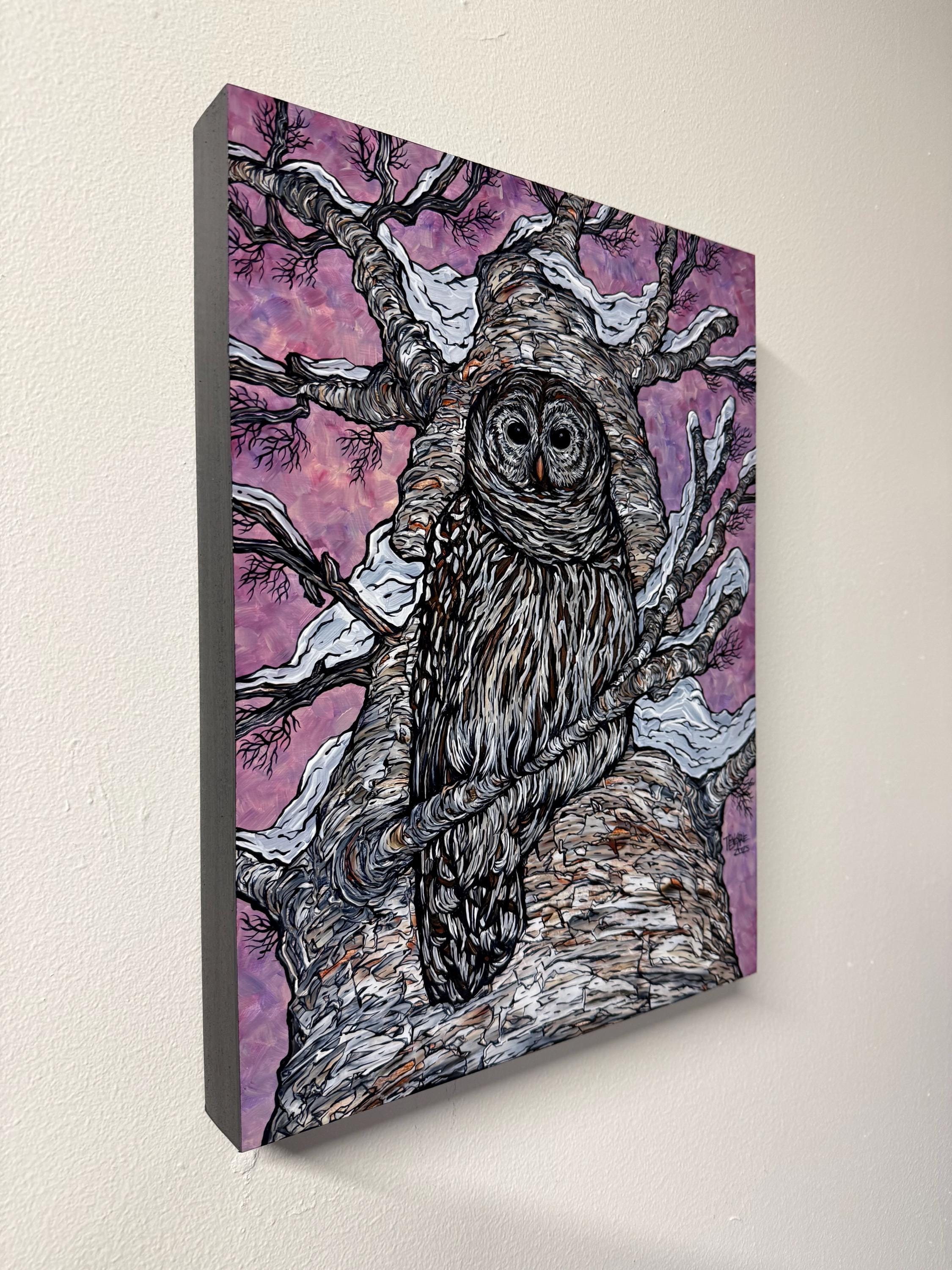 A beautiful barred owl in a snowy tree.