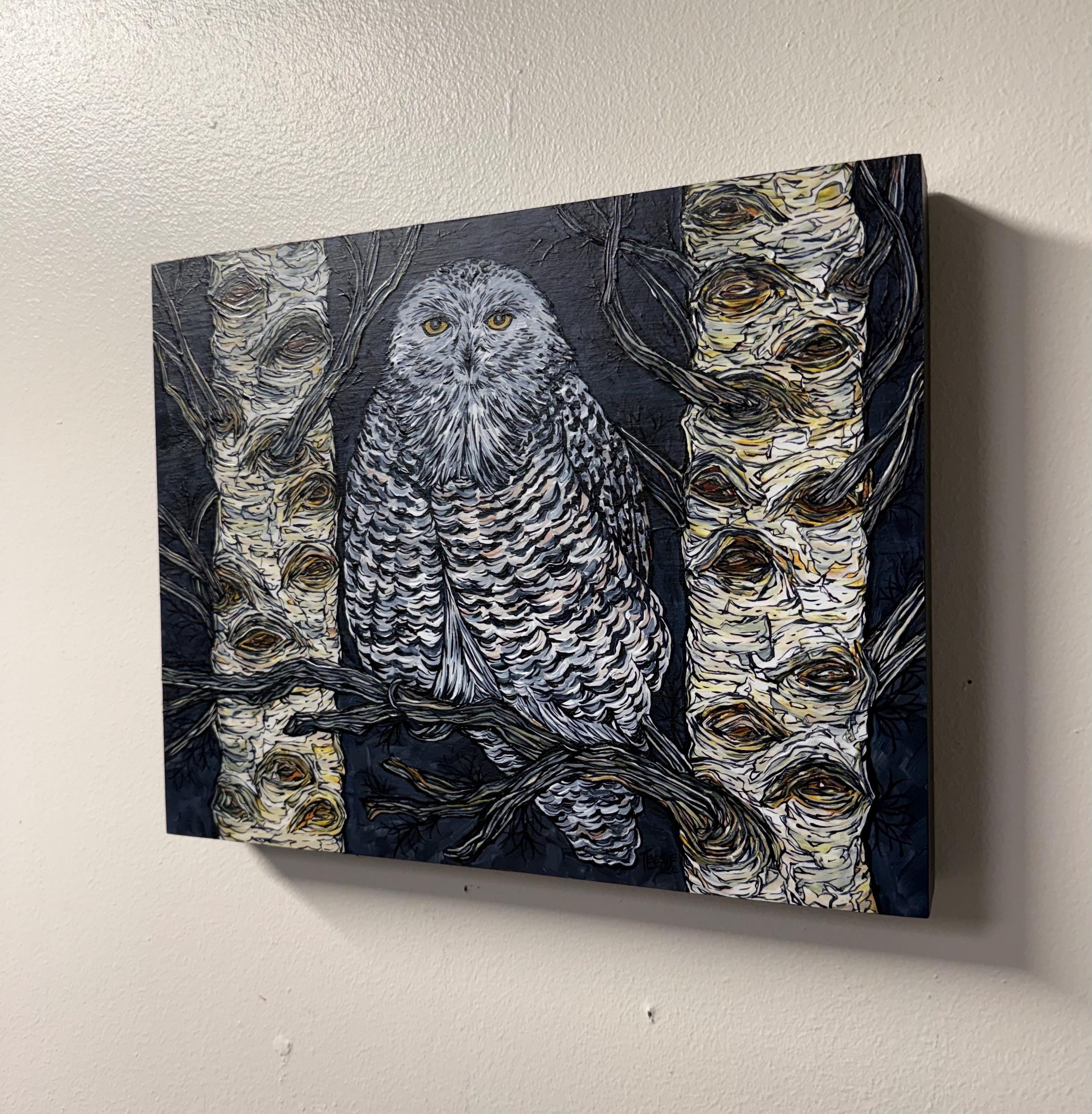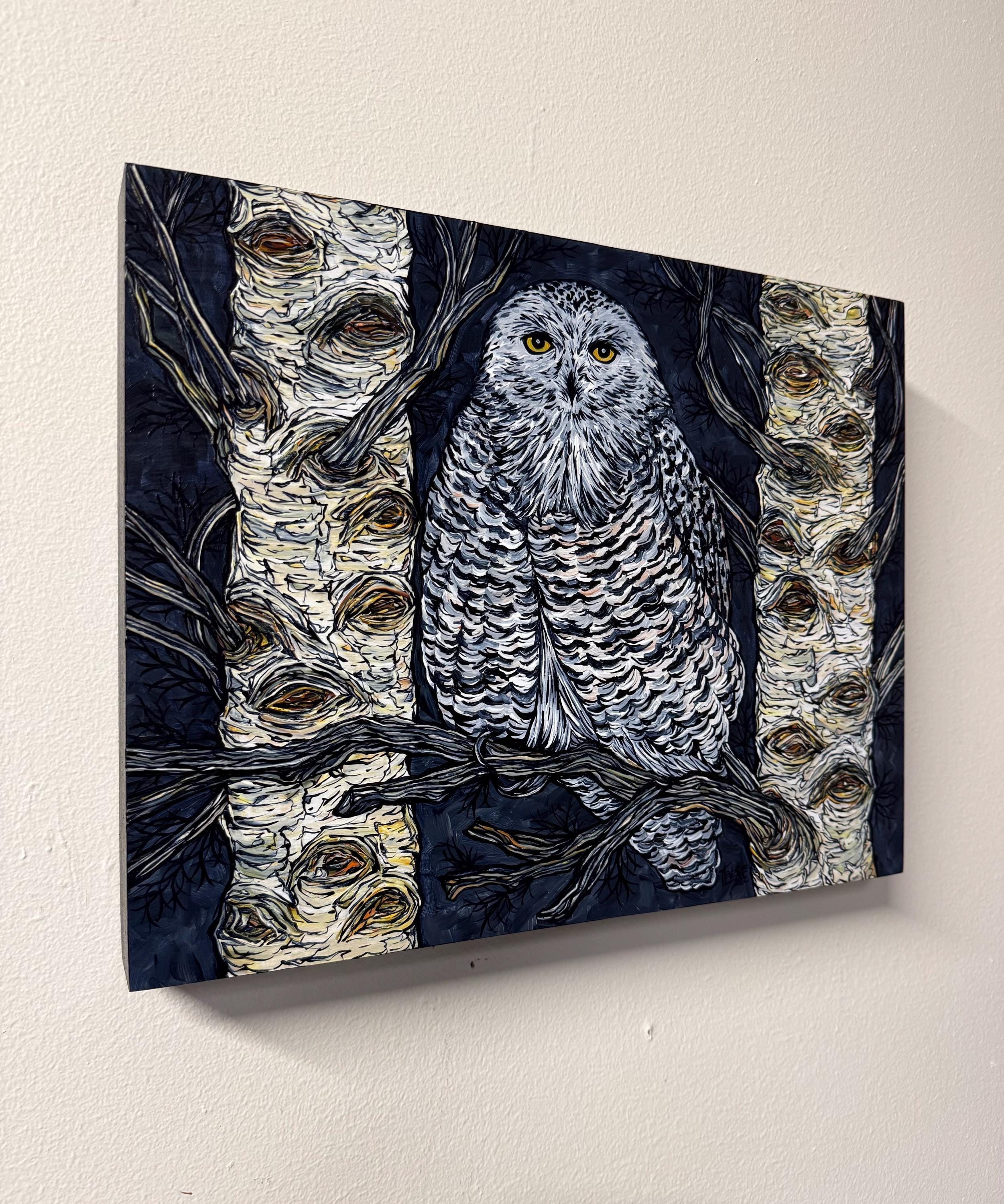 Painting of a beautiful snowy owl in the night trees.