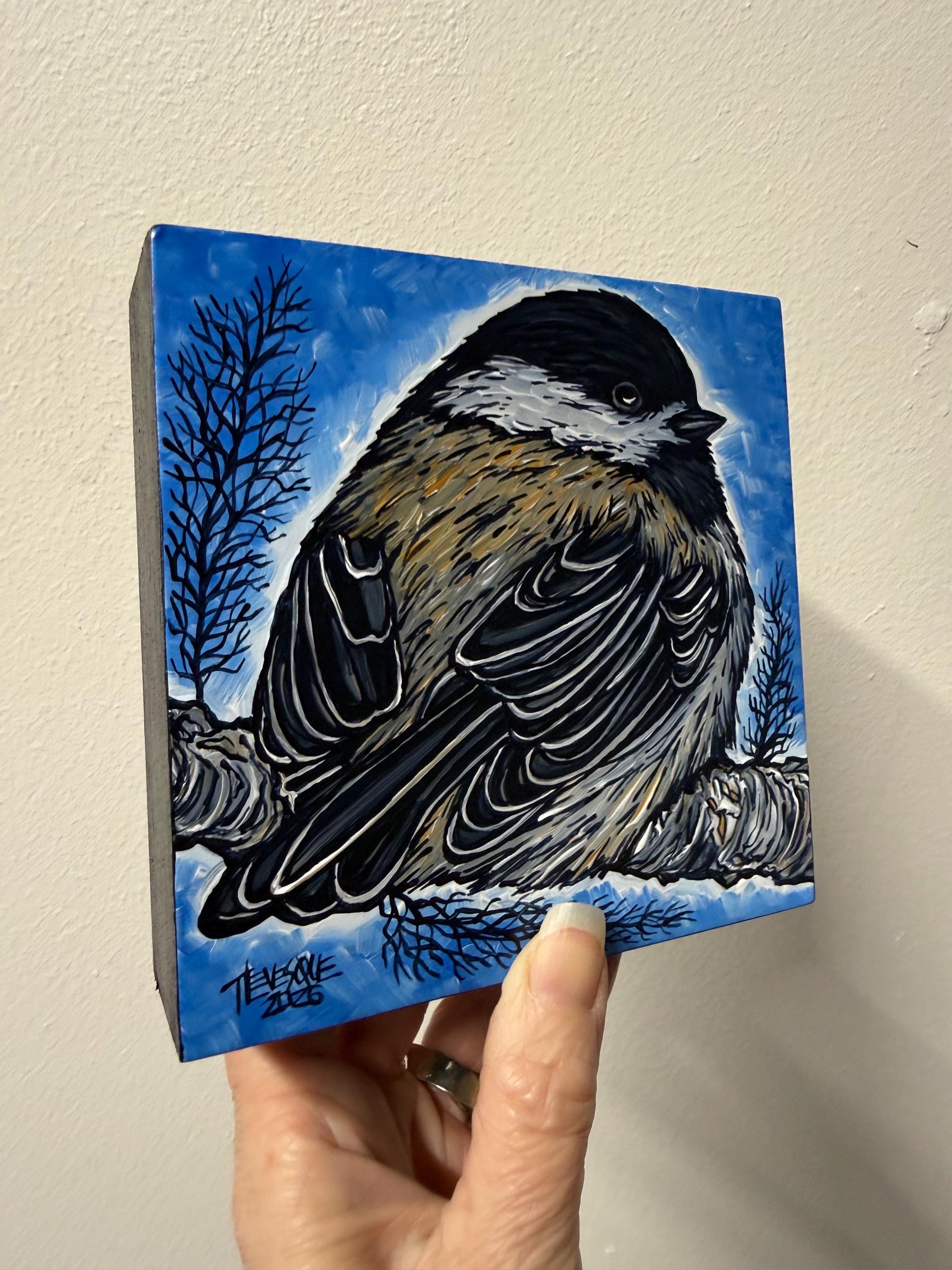 Painting of an adorable black-capped chickadee.