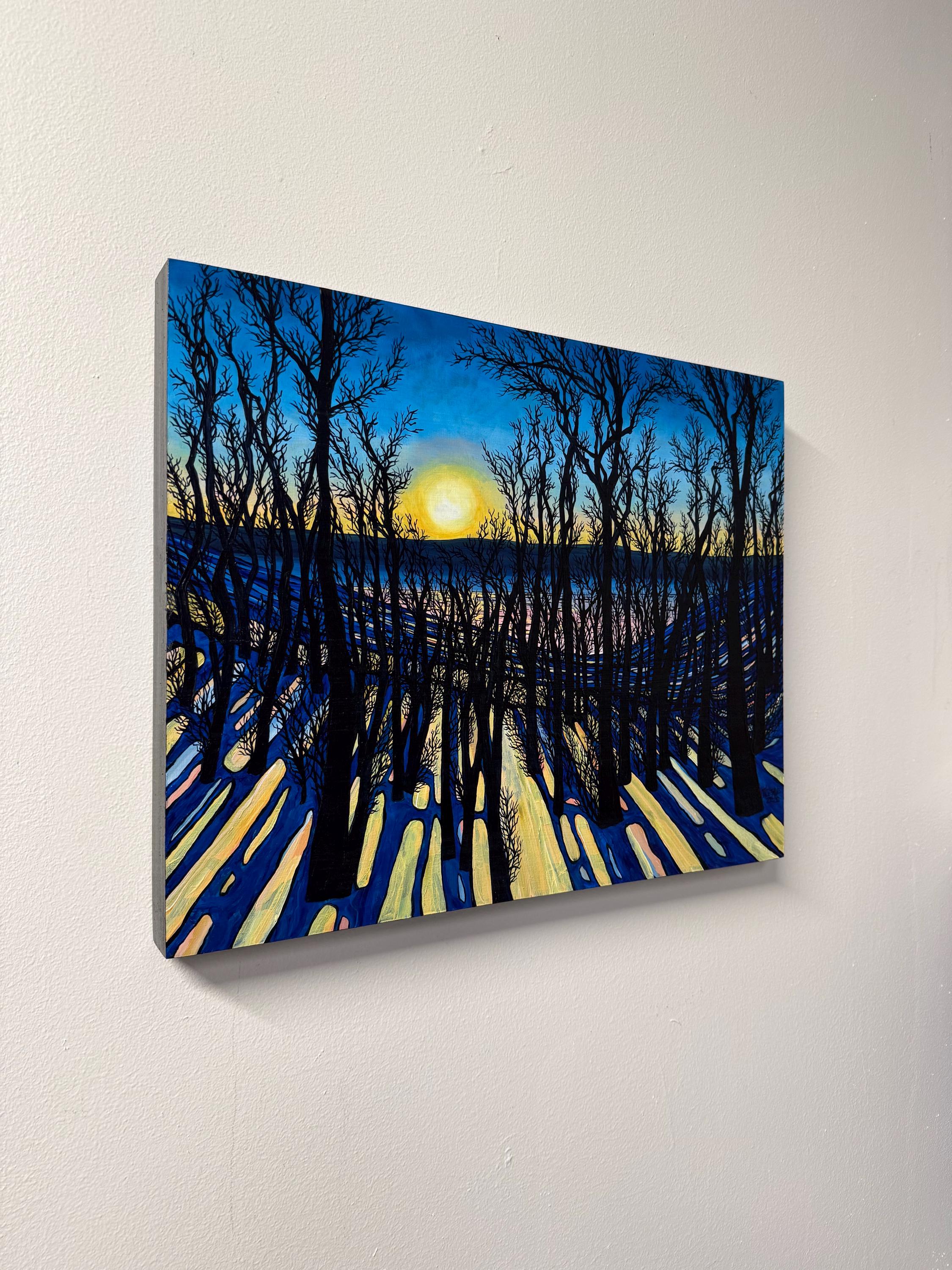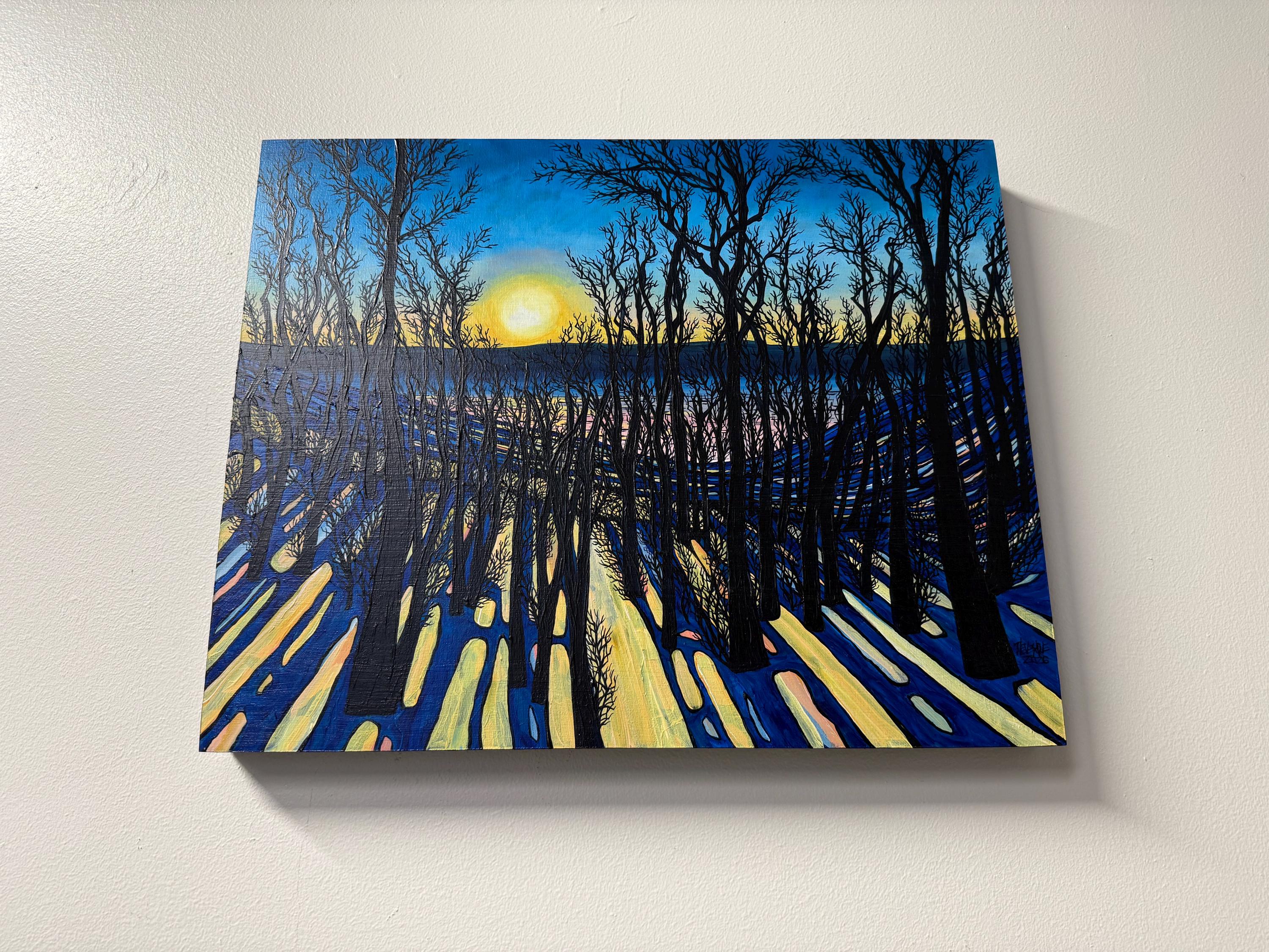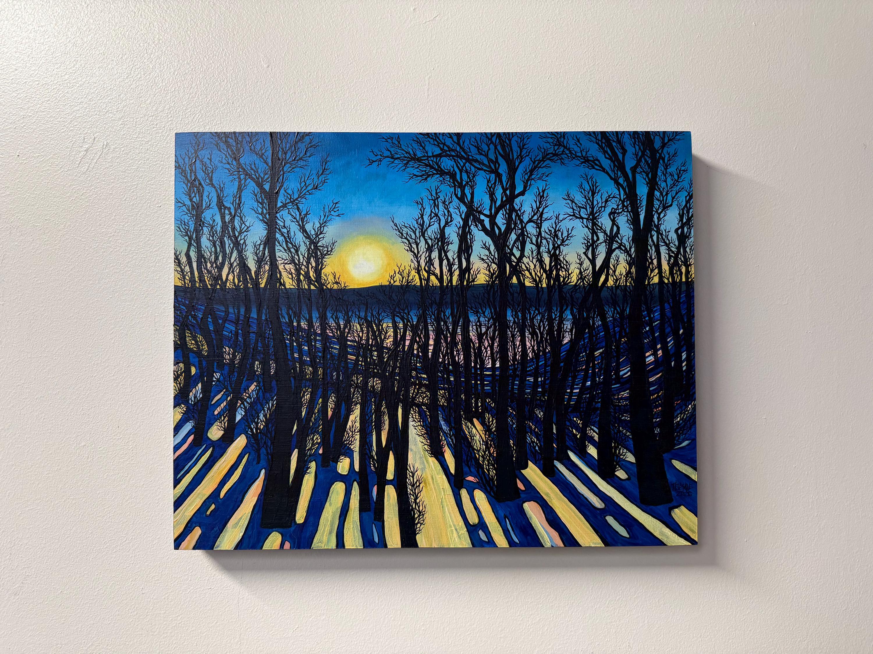 Stunning depiction of sunlight casting shadows in the snow in this beautiful winter landscape painting.