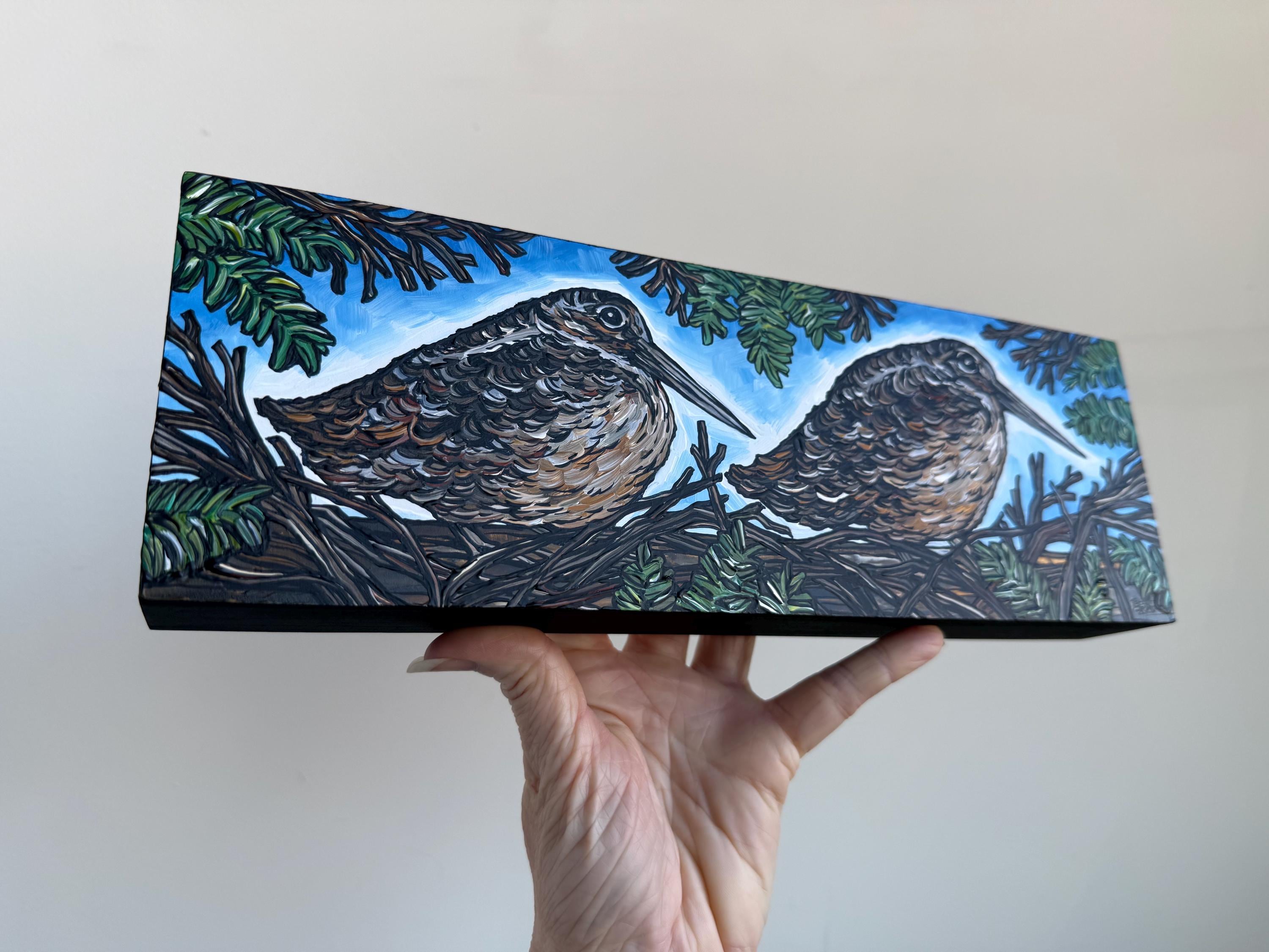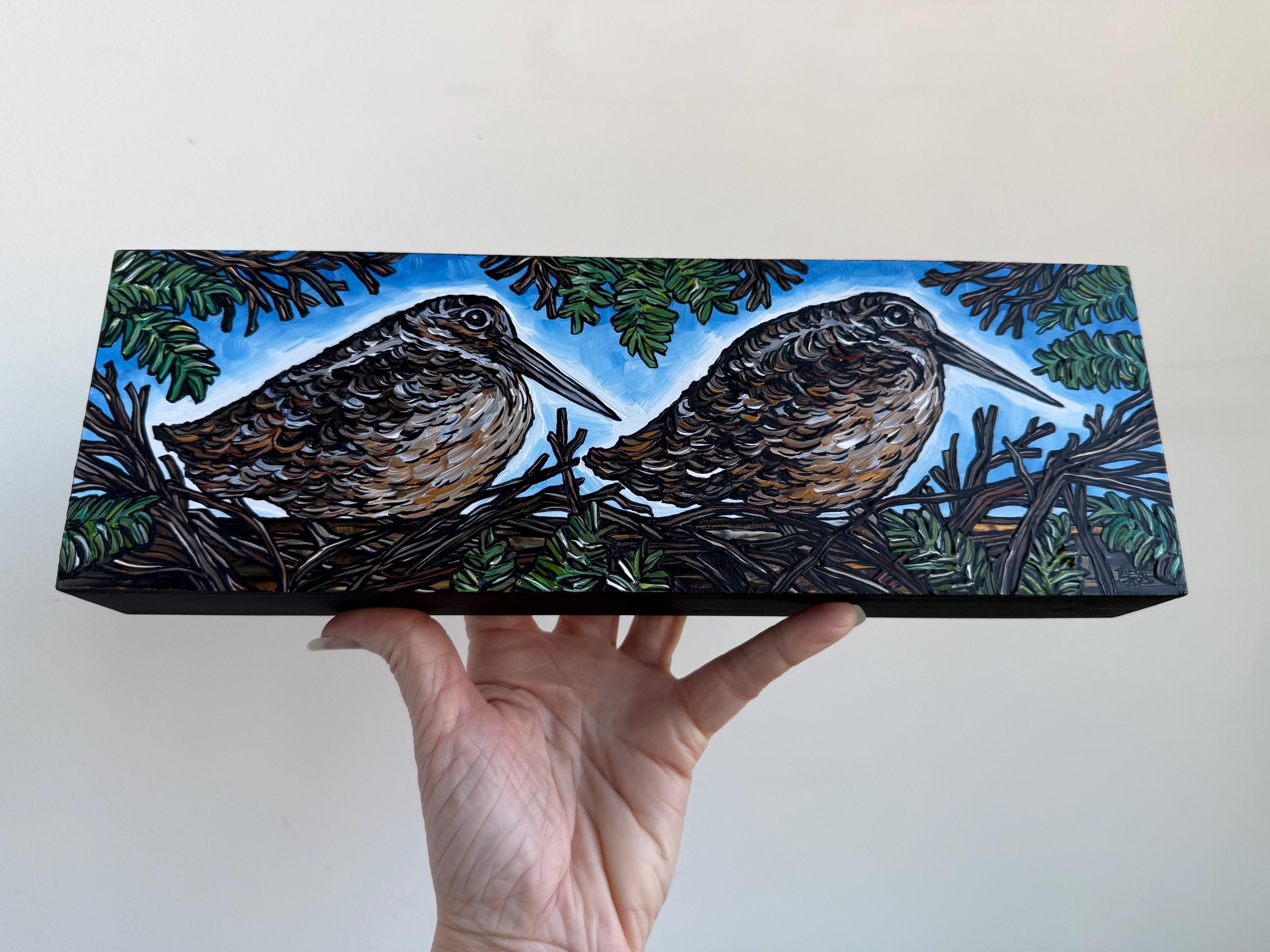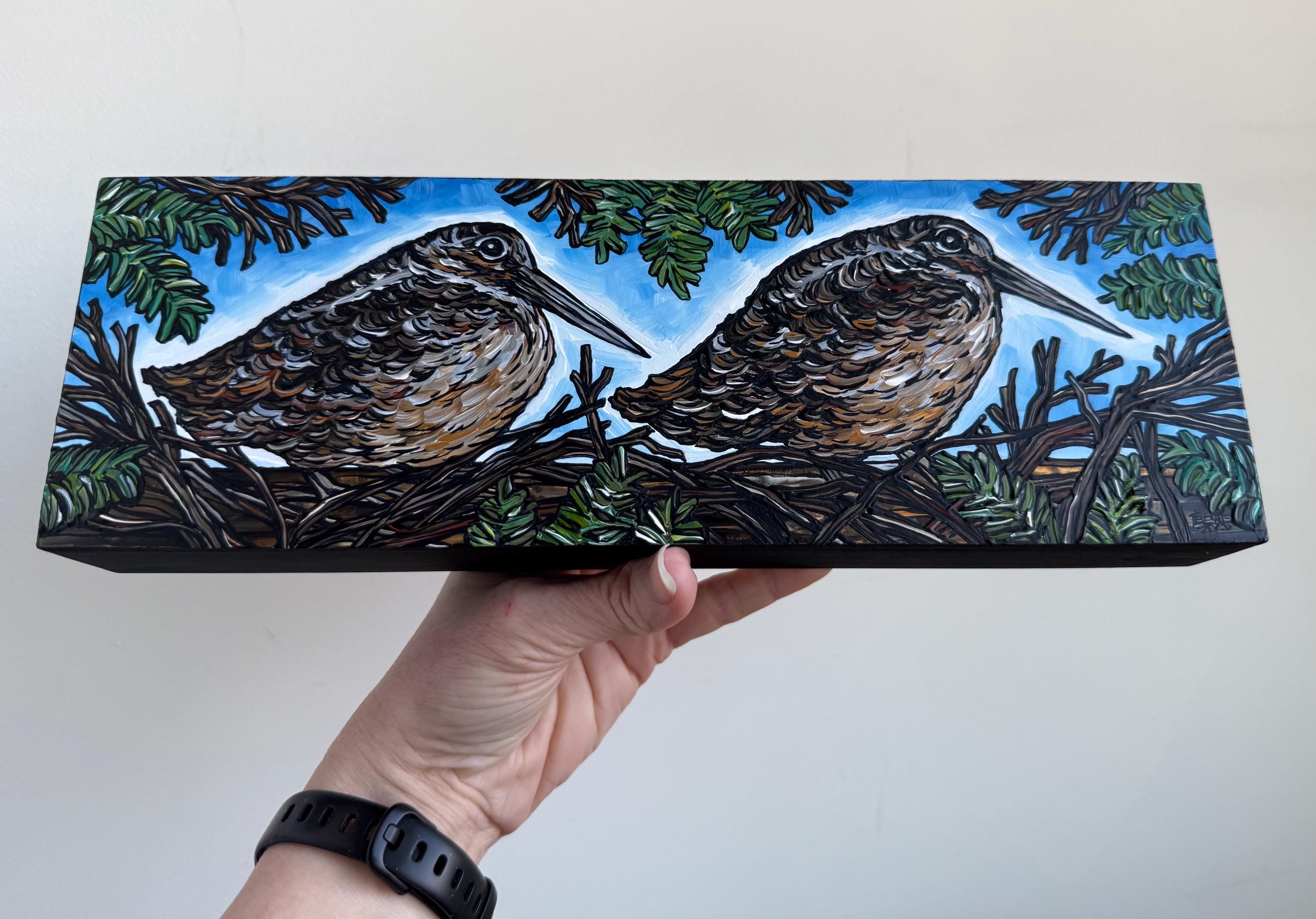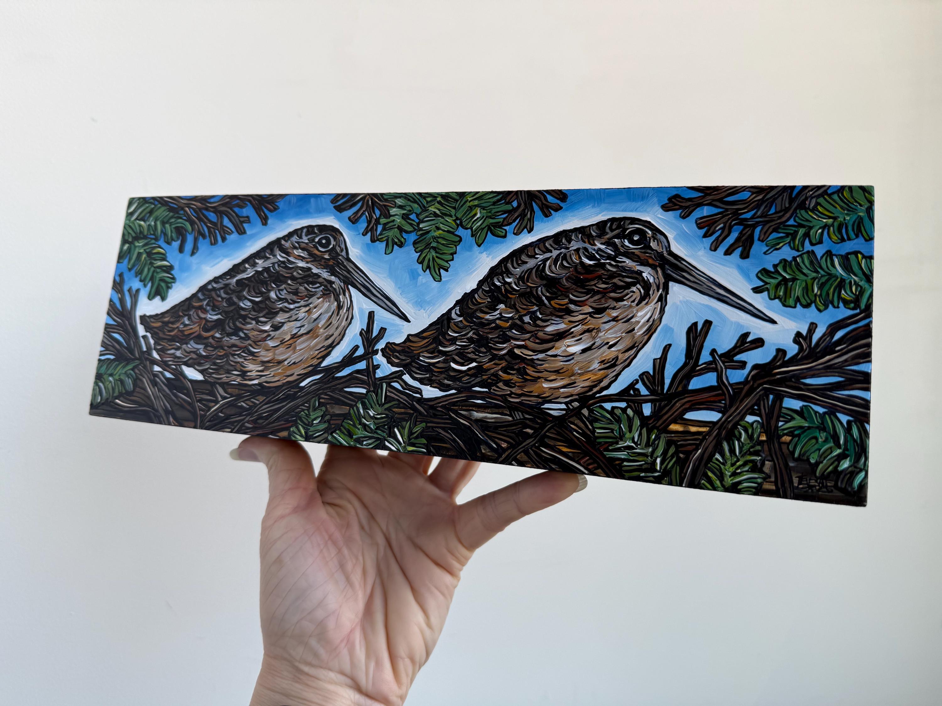 Relish the magic of the American Woodcock all year round with this delightful painting of timberdoodles.
