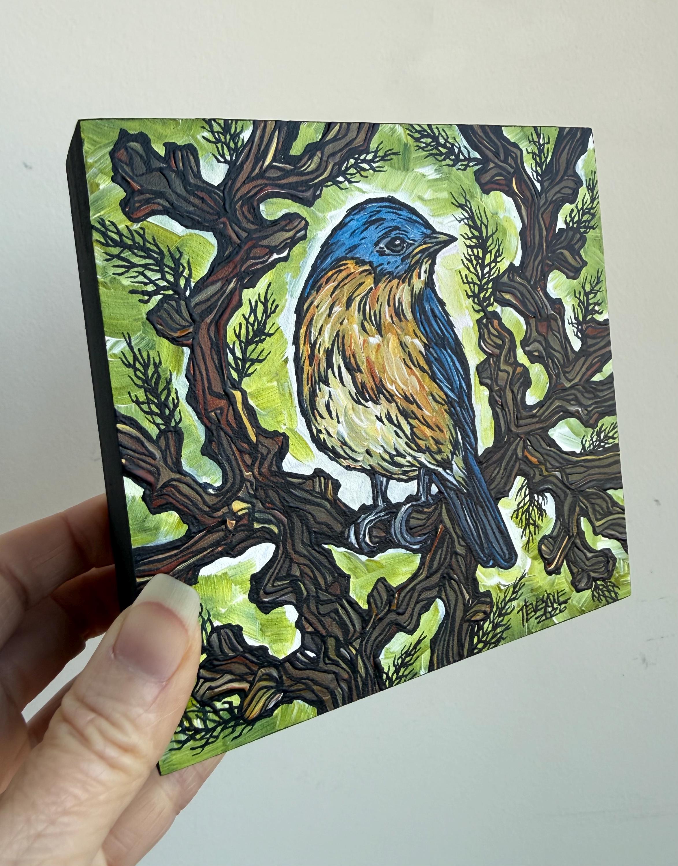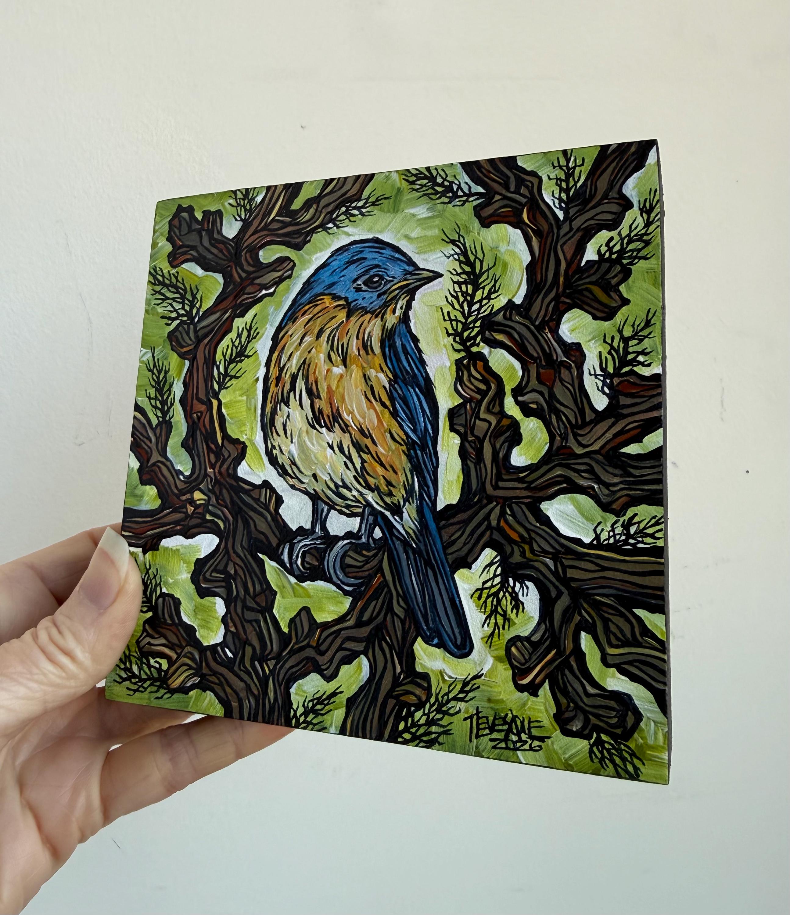 5x5” Original acrylic painting on 1.5” deep cradled wood panel by Tracy Levesque. Painting is varnished with the edges are painted black for a clean ready-to-hang finish. Painting has hanging hook on the back but may also sit nicely on a shelf.
