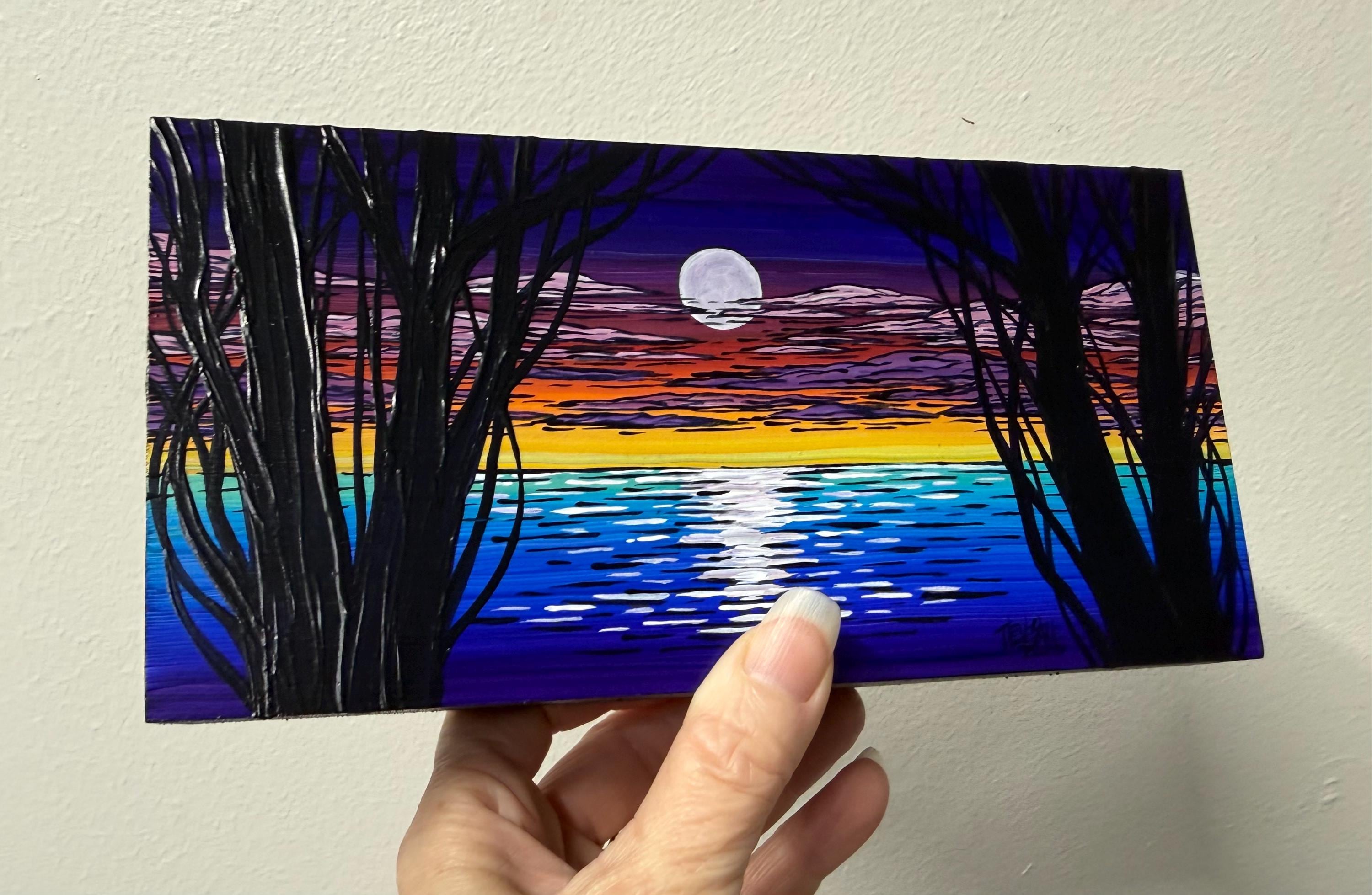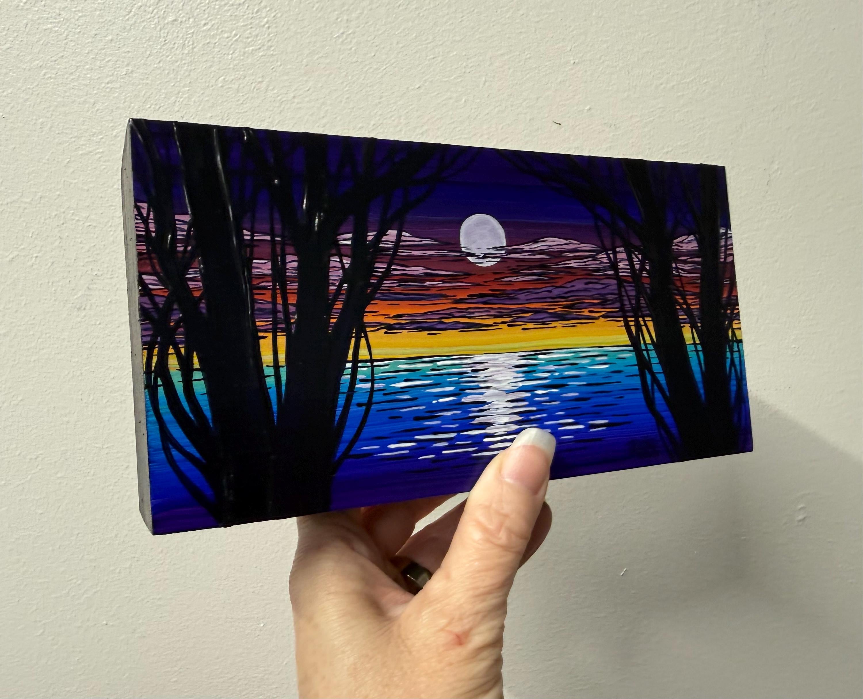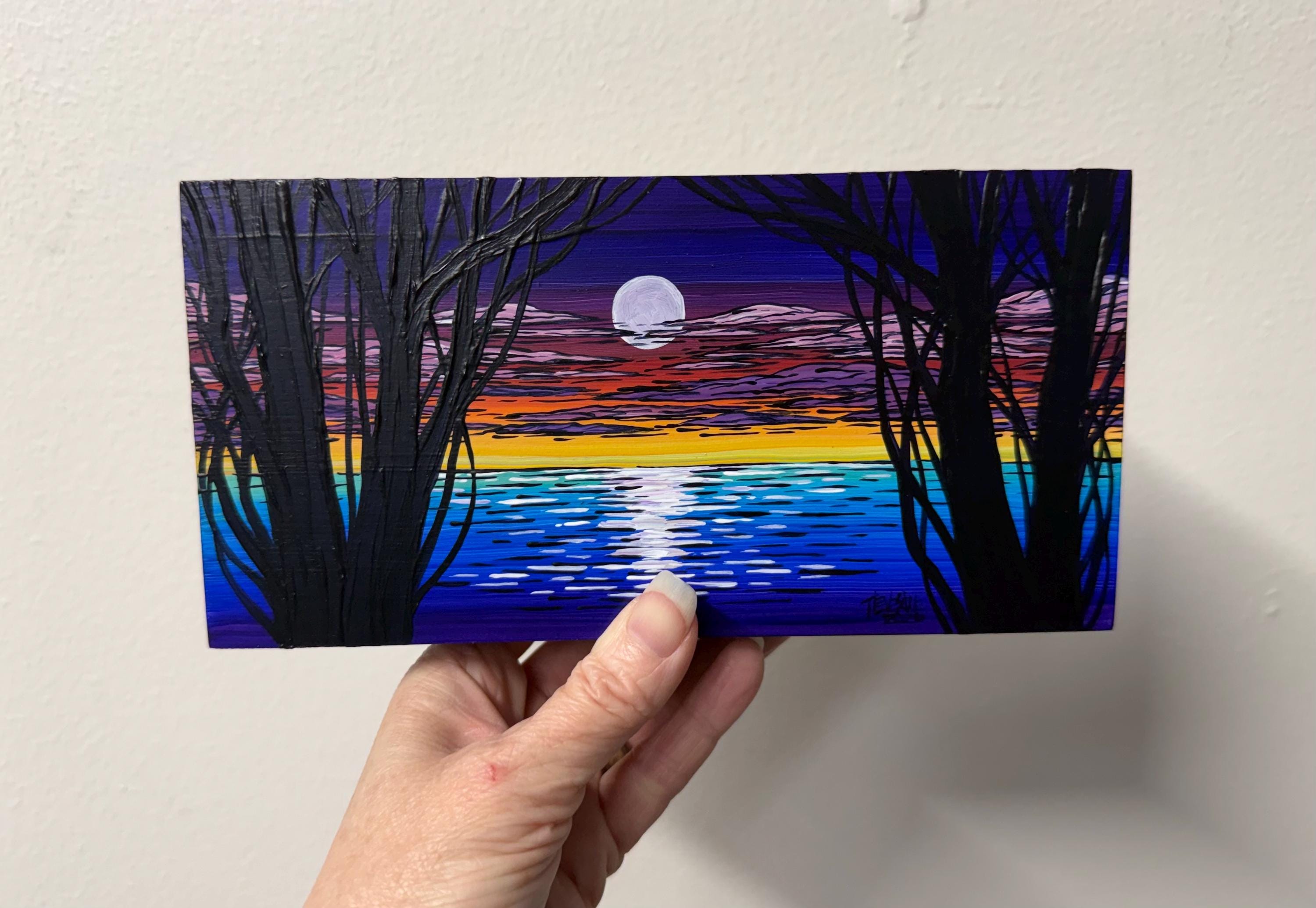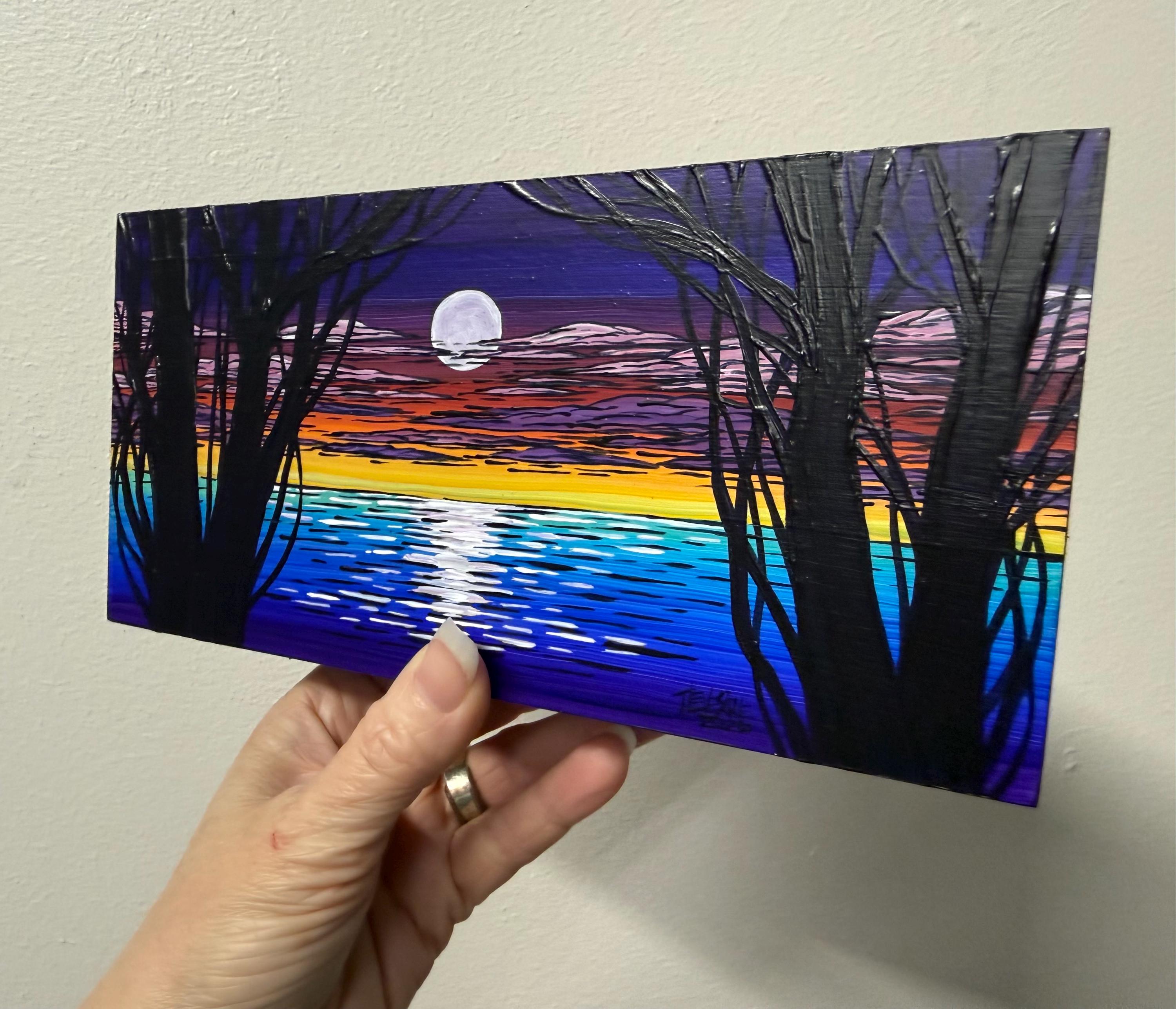 4x8” Original acrylic painting on 1.5” deep cradled wood panel by Tracy Levesque. Painting is varnished with the edges are painted black for a clean ready-to-hang finish. Painting has hanging wire on the back but may also sit nicely on a shelf.