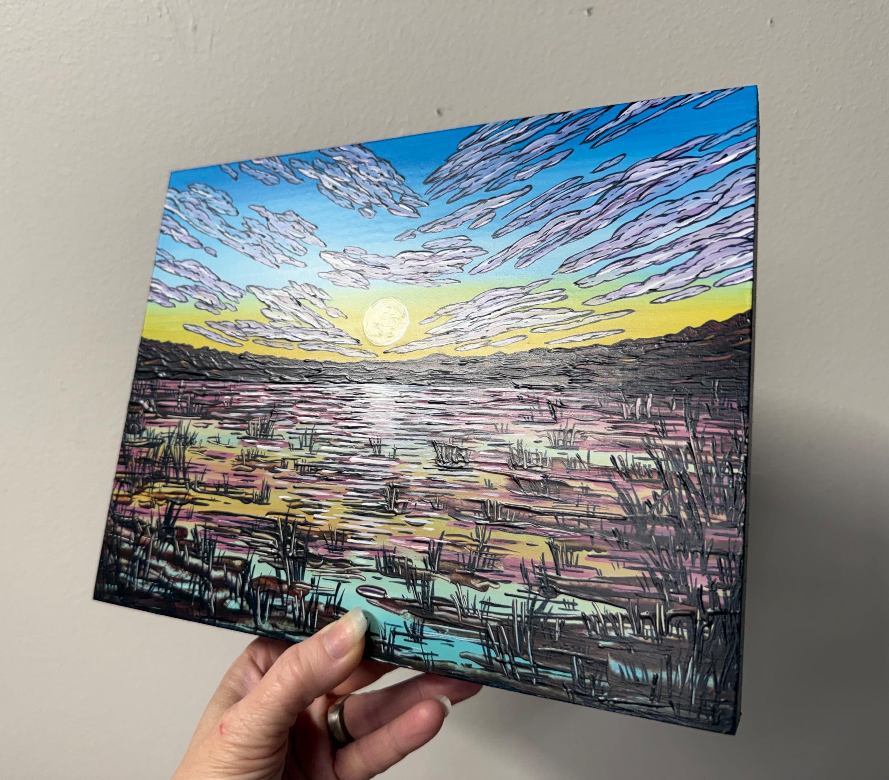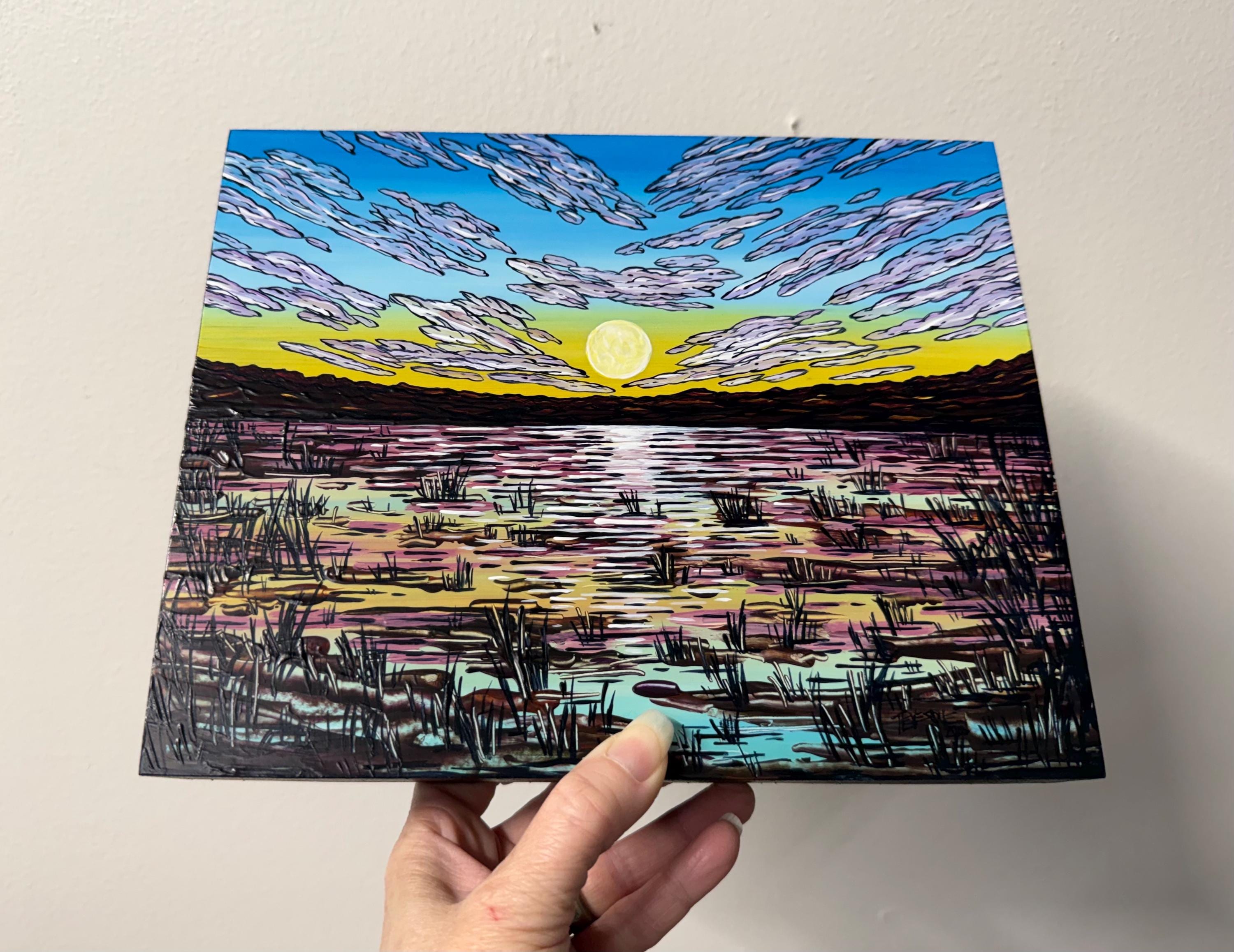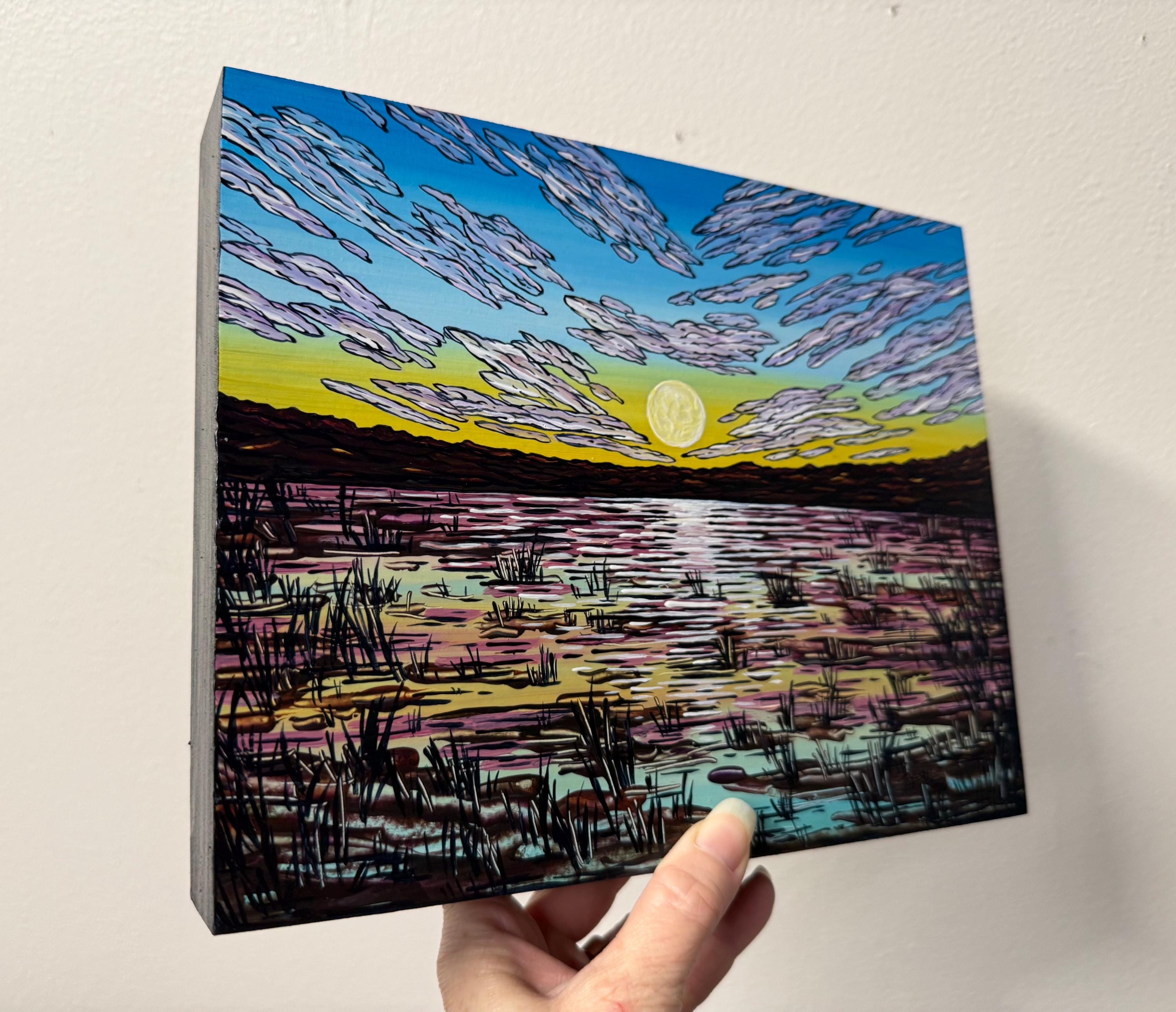 8x10” Original acrylic painting on 1.5” deep cradled wood panel by Tracy Levesque. Painting is varnished with the edges are painted black for a clean ready-to-hang finish. Painting has hanging wire on the back but may also sit nicely on a shelf.