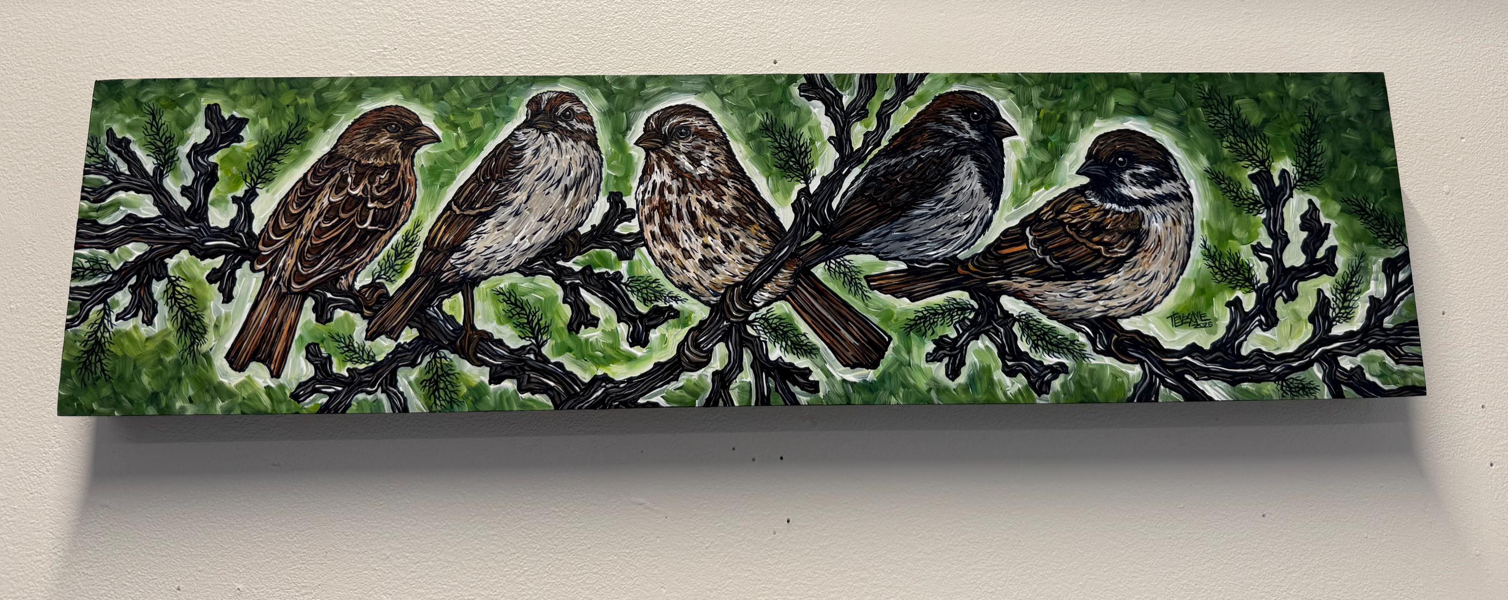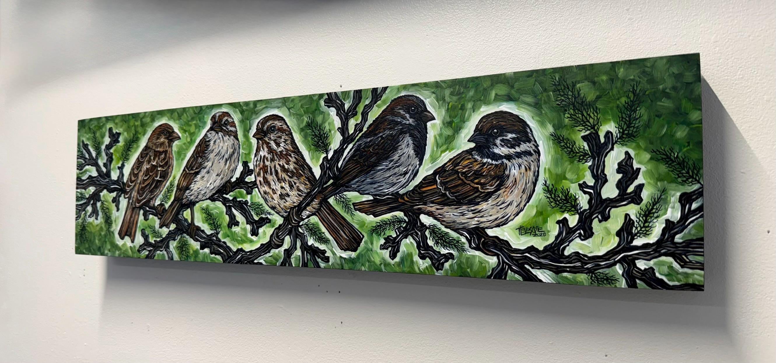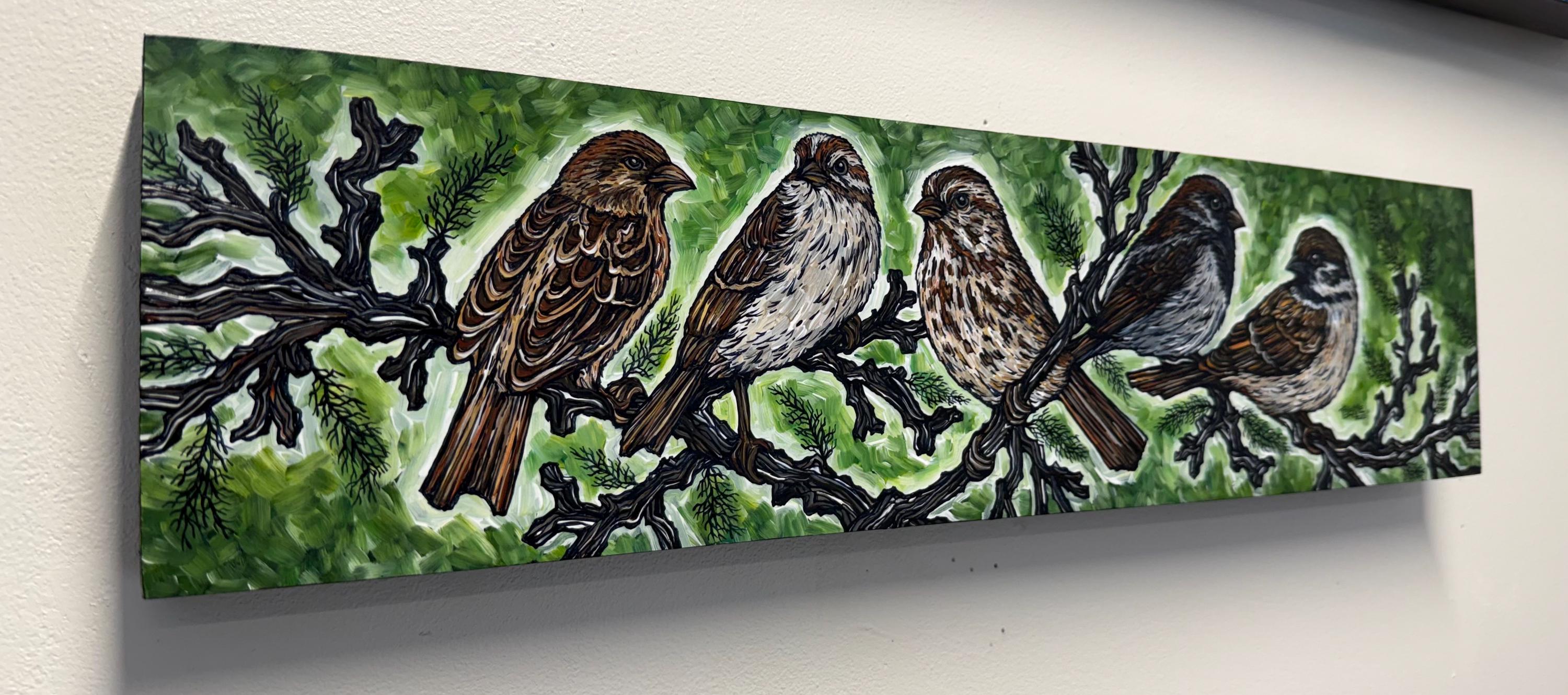 6x24” Original acrylic painting on 1.5” deep cradled wood panel by Tracy Levesque. Painting is varnished with the edges are painted black for a clean ready-to-hang finish. Painting has hanging wire on the back but may also sit nicely on a shelf.